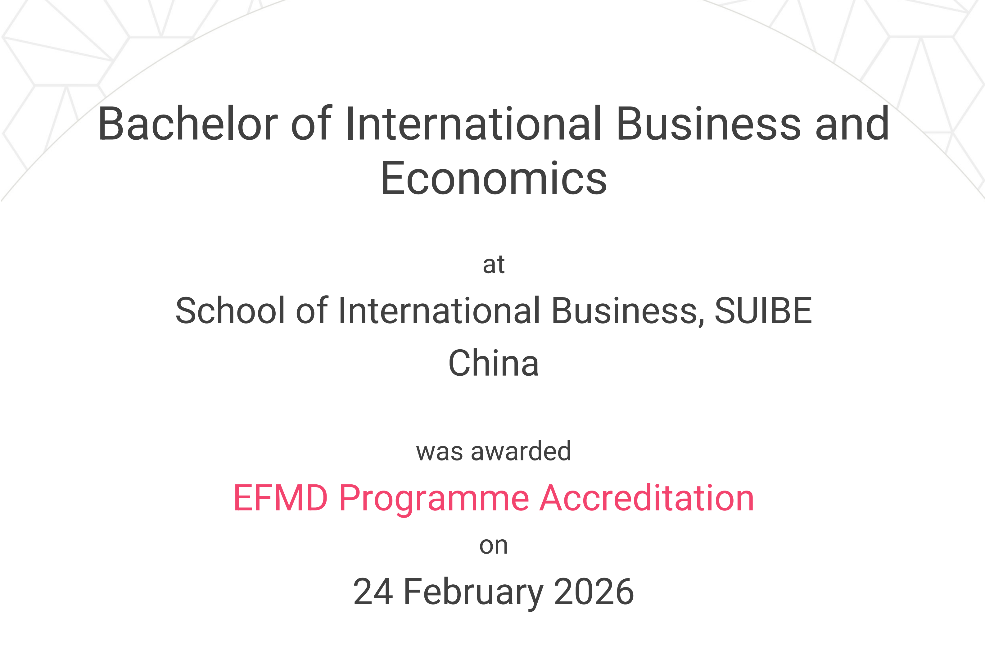近日,上海对外经贸大学国际经济与贸易专业本科项目正式通过欧洲管理发展基金会(EFMD)国际认证,首期认证期三年。作为全球管理教育领域的“黄金标准”,EFMD认证是评判商科项目国际竞争力的关键标杆。此次荣获认证,标志着国际经济与贸易专业正式跻身全球高水平教育行列。特色育人模式赢得国际认可国际经济与贸易专业依托国家一流本科专业建设点,围绕学院“立足上海·服务全球”的定位,将全球视野、跨文化能力与可持续发展素养等核心特质融入人才培养全过程。专业以MASTER六大价值理念为基础,聚焦塑造“ULTRA特质”复合型人才,构建起以“四轨并行”课程体系为骨架、“双导师制”为支撑、“ERS理念”为价值导向、“闭环式质量保障机制”为保障的特色人才培养体系。这些创新实践,成为项目获得EFMD国际权威认证的核心基石。专家现场评审高度肯定学校国际化办学实力在学校统一部署及各职能部门支持下,国际经贸学院对标国际标准,聚焦课程、师资、教学与质量保障等关键领域,以评促建系统推进国际认证工作。2025年10月,EFMD国际认证专家组进校现场评审。2026年2月24日,EFMD认证委员会正式宣布项目通过认证。决议高度认可