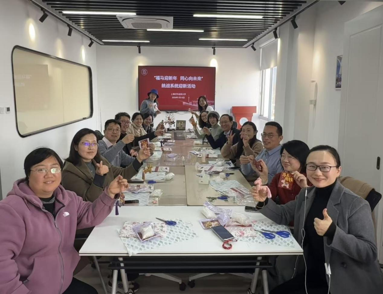 冬阳暖照,锦韵传情。为传承中华优秀传统文化,凝聚统战成员同心共识,1月12日中午,学校在松江校区乐群楼统战成员之家开展统战系统“福马迎新年,同心向未来”迎新活动。党委统战部、各民主党派基层组织和统战团体成员、二级党组织负责人及统战委员等教师代表共聚一堂,在指尖感悟匠心,共话新年期许。“宋锦”被誉为中国“锦绣之冠”,其纹样精致、色泽典雅;“福马”则是应景2026年丙午马年,承载象征奋进不息、马到成功之寓意。活动现场,指导老师详细讲解了宋锦的历史渊源、纹样寓意及填充缝制的关键技巧,各位老师从织物填充、缜密缝合到搭配流苏吊坠配饰,亲手体验了国家级非物质文化遗产“宋锦福马”的制作技艺。老师们团结同心、彼此协助,解决“技术难题”,化身“巧手工匠”,在指尖流转间,原本零散的材料逐渐变成了一个个形态灵动、寓意吉祥的宋锦福马挂饰,完成了一次与传统文化的深度对话。拿着手中独一无二的福马手作,老师们畅叙交流,现场氛围热烈温馨。本次活动将中华优秀传统工艺与统战工作深度融合,不仅为大家送上了一份独具文化底蕴的新春祝福,也以文化为纽带为统战系统搭建了联谊交友、沟通交流的桥梁,拉近了情感距离、凝聚了思想共识。20