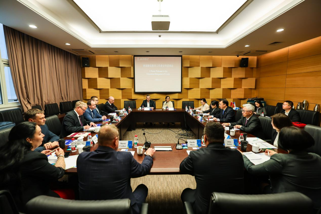 4月14日上午,在教育部语合中心的支持下,捷克教育工作者访华团一行来我校访问。访华团成员有布杰约维采商业技术学院副校长Vojtech Stehel、TKP教育集团董事长Robert Sinkner、布杰约维采商业技术学院工程系主任Vilem Kovac、塔博尔高中国际课程主任Jitka Kubu、布杰约维采商业技术学院孔子课堂(以下简称布杰孔堂)外方院长Monika Hruba等教育界和产业界人士。校长汪荣明在长宁校区会见了访华团一行,学校外事处处长金泉、布杰孔堂中方院长郝文钧及相关工作人员参加会见,会议由外事处副处长张水辉主持。汪荣明代表学校对捷克教育访华团的来访表示欢迎,并介绍了学校最新发展情况。他表示,2026年是中捷建交77周年,两国在“一带一路”框架下有着广泛的合作。学校与布杰约维采商业技术学院共建的孔子课堂,五年来持续发展壮大,既在捷克培养了大量中文学习者和中国文化爱好者,也向中国展现了捷克的魅力,为增进两国人民之间的相互了解和友谊做出了积极贡献。他进一步指出,自双方建立合作以来,互访活跃,师生交流频繁。希望布杰孔堂在保持传统特色的同时,突出商务、文旅特色,通过持续创新合作