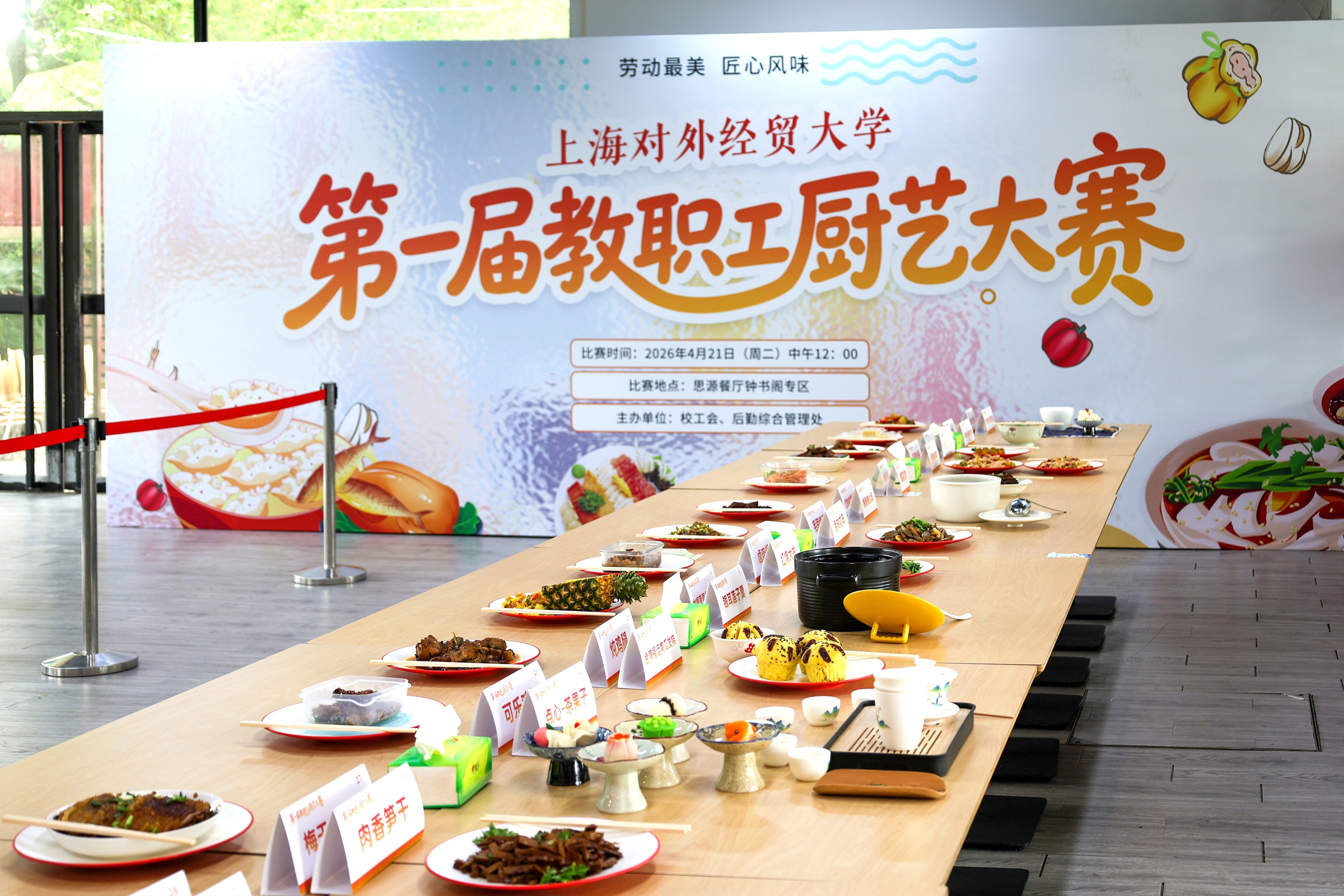 上海对外经贸大学第一届教职工厨艺大赛开赛了!为庆祝第137个国际劳动节,弘扬劳动精神,展现教职工积极向上、热爱生活的精神风貌,增强校园凝聚力与归属感,4月21日中午,由上海对外经贸大学校工会(妇工委)、后勤综合管理处联合主办的首届教职工厨艺大赛在松江校区思源餐厅圆满举办。本次大赛以“劳动最美,匠心风味”为主题,共吸引来自全校各单位的41名教职工报名参赛,他们各显神通,为现场师生带来了一场兼具美味与创意的饮食文化盛宴。本次大赛设置两大特色赛道,参赛老师们各展所长,现场气氛热烈有序。赛道一“自带菜品·加热品鉴”共有29位老师参赛,带来29道各具特色的精美菜品,涵盖热菜、凉菜、汤羹、甜品等多个品类,既有充满地域特色的家乡风味,也有融入创意巧思的创新菜品。参赛老师提前精心制作菜品,现场完成加热摆盘,每道作品都兼顾美味、营养与颜值,充分展现了教职工们精湛的烹饪技艺和对生活的热爱。获得一等奖的景婧老师来自国际商务外语学院,为了传播中华优秀传统文化,她专门学习了这门手艺,此次参赛的作品也是课程成果之一。她说,“常言知行合一,劳动之美在于心手相契。茶点佐一盏清茶,不过是将书中风物揉进一方粉糯。专业之趣