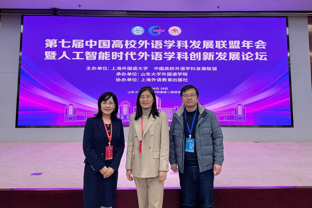 12月26日至28日,第七届中国高校外语学科发展联盟年会暨人工智能时代外语学科创新发展论坛在山东大学召开。来自全国160余所院校200余位外语学科专家学者汇聚一堂,围绕人工智能时代外语学科的创新发展路径开展了深入的探讨。姜秀珍副校长出席年会并作了题为“人工智能背景下财经类高校外语学科与专业建设路径探索”主旨发言。姜秀珍副校长首先结合习近平总书记关于教育的重要论述及全国教育大会精神,对人工智能背景下高等教育面临的机遇和挑战进行了分析,她强调,高校要超前谋划人才培养目标,提升与社会需求的适配度;同时指出,人工智能正从工具向伙伴转变,人机协作、跨界融合将成为必然趋势。她结合我校的办学定位与特色,分析了我校外语学科在学校学科建设和事业发展中的地位和作用。她指出,我校外语学科的核心任务不再是培养单纯的语言人才,而是培养掌握“通用语言、通用规则、通用管理、通用工具”,深度服务国际经贸、国别区域研究、国际传播及国际组织的复合型高端外语人才。随后,她结合我校《人工智能赋能教育教学三年行动方案》,分享了我校外语学科在学科专业调整、人才培养方案与课程体系更新、学科交叉融合、AI赋能教育教学、产教融合协同育