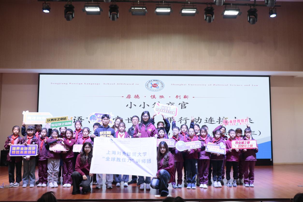 12月9日下午,上海对外经贸大学“全球胜任力”讲师团走进上海政法学院附属松江外国语学校,为四年级学生开设微课。上海政法学院附属松江外国语学校(“上政附外”)校长李燕华、教导处主任韩亚婷,上海对外经贸大学国际组织学院(贸易谈判学院)党委副书记程栋、兼职辅导员邓静雯、4名讲师团成员以及上政附外近百名学生共同参与。首堂课程由国际组织学院2024级国际经贸规则专业孙婧瑜、孙仪嘉、权一能同学共同讲授,围绕“语言密钥:打开全球胜任力的大门”展开。他们从联合国六种官方语言切入,阐释了语言在国际组织运行、外交谈判与国际传播中的关键作用。他们结合“语言+专业”的真实案例,引导学生理解外语不仅是交流工具,更是连接世界、参与全球事务的桥梁,并鼓励大家通过学好外语、打牢学科基础,提升跨文化沟通能力、拓展国际视野。第二堂课程以“在全球治理的实践中挺膺担当”为题,由2024级法学(涉外经贸法治卓越人才班)本科生吴奇正讲授。他结合前往日内瓦世界贸易组织、世界卫生组织等国际组织深度研学的经历,讲述了中国参与全球治理的实践故事,引导同学们认识全球议题与日常生活的紧密联系。通过模拟联合国等案例,他鼓励青少年从小树立责任意