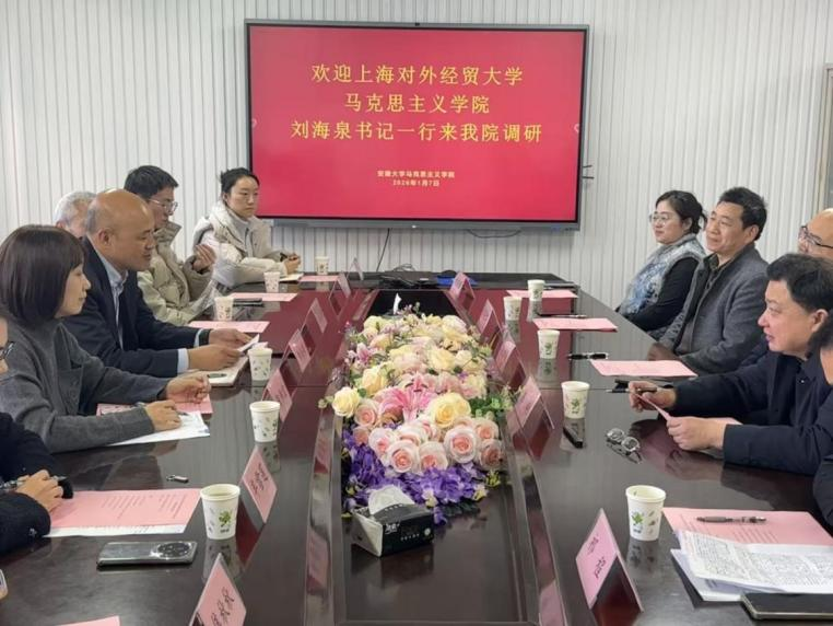 为深化党建与业务融合,探索高质量党建引领高质量发展的新路径,2026年1月7日至8日,马克思主义学院教工第二党支部赴安徽合肥开展主题党日研学活动。本次活动以“结对共建”与“沉浸研学”双线并进,通过校际交流汲取智慧,通过红色足迹锤炼党性,通过历史文脉增强自信,有效提升了活动的政治性、思想性与实效性。1月7日,马克思主义学院党委书记刘海泉带领支部教师前往安徽大学马克思主义学院,围绕“标杆引领提质效,融合聚力谋发展”主题开展结对交流座谈会。座谈会由安徽大学马克思主义学院党委书记潘金刚主持,他对我校马克思主义学院一行的到来表示热烈欢迎,并期待通过支部结对,与兄弟院校在学科发展、教学实践、党建创新上互学互鉴,共同破解发展难题。安徽大学马克思主义学院院长李明详细介绍了学院在学科建设、思政课改革、师资队伍建设等方面的成果与经验。刘海泉对安徽大学马克思主义学院的热情接待和倾囊相授表示衷心感谢,他介绍了学院在学科特色凝练、思政课教学创新、党建与业务深度融合等方面的探索与实践。他表示,此次全国样板党支部“走出去”与兄弟院校优秀支部结对,是激活组织动能、拓宽发展视野的关键一步,安徽大学马院的宝贵经验为我们提