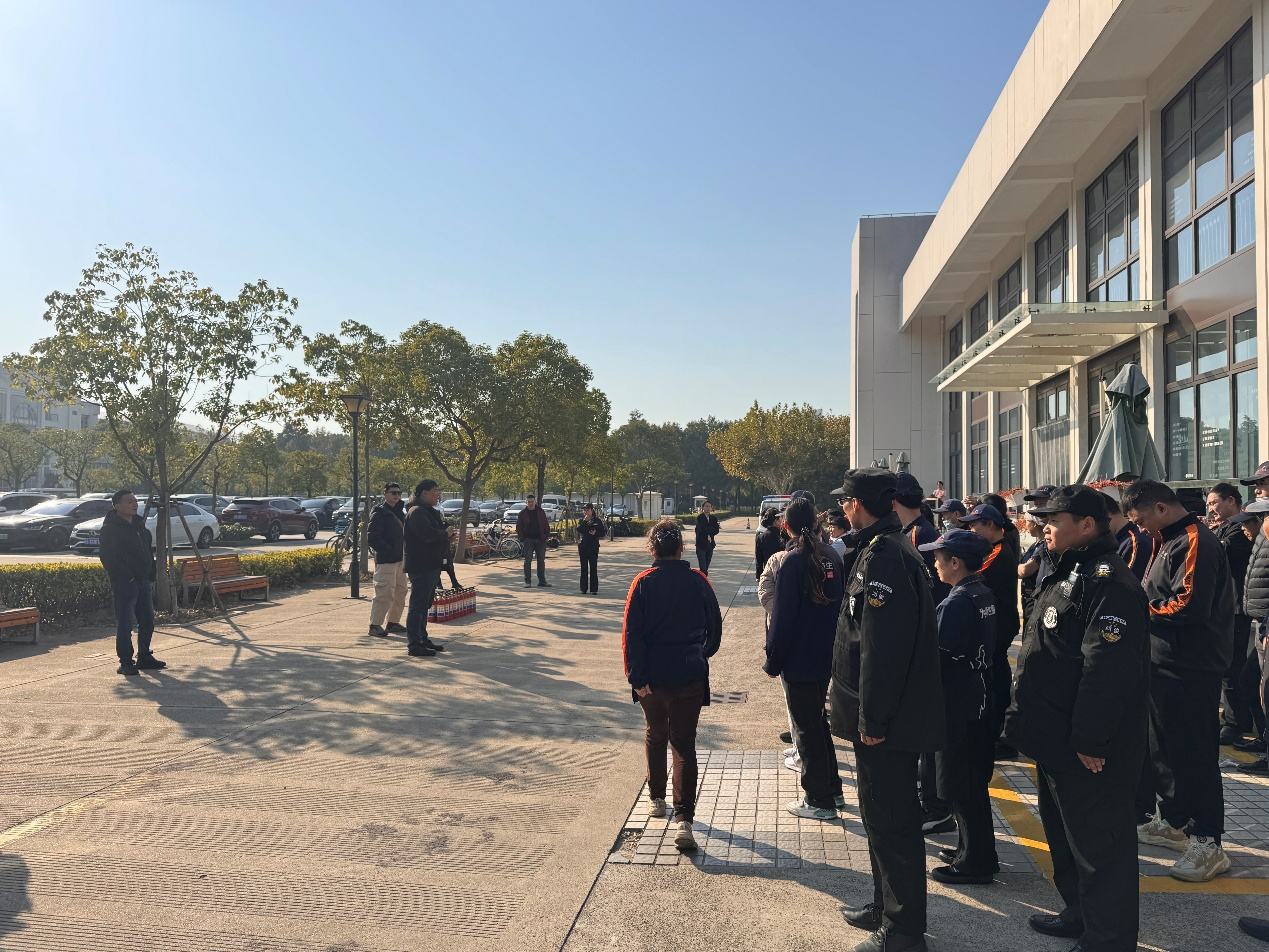 为切实提升食堂员工消防安全意识与应急避险能力,近日,保卫处联合后勤综合管理处在松江校区学生第一食堂开展应急逃生疏散演练活动。保卫处副处长马民杰、后勤综合管理处副处长徐峰、保卫处消防科全体成员以及食堂工作人员共同参与活动。下午2时,全体参演人员于第一食堂南侧集合完毕,保安公司经理蒋建伟就演练的重要意义、疏散路线、注意事项及安全纪律进行了详细说明,并重点强调了全体成员需要严肃对待,确保演练过程安全、有序,随后引导食堂工作人员恢复工作状态。下午2时15分,马民杰下达疏散演练开始指令,保安队员随即在指定位置点燃烟饼,声光联动警报同步启动。全体参与人员迅速进入应急状态,弯腰低姿,沿预设疏散路线快速、有序撤离。演练过程中,各关键点位均有保安队员指引,整体秩序井然。全体参与演练人员安全撤离至指定集结区域后,各小组立即清点人数,并确认上报。随后转入灭火器实操体验环节。蒋建伟现场讲解了干粉灭火器的构造、工作原理及“提、拔、握、压”四字口诀,并进行了标准的操作演示。食堂工作人员认真观摩后,轮流上场进行实操练习,有效掌握了灭火器的正确使用方法,提升了初期火灾的应急技能。马民杰在总结中强调,食堂作为校内人员密
