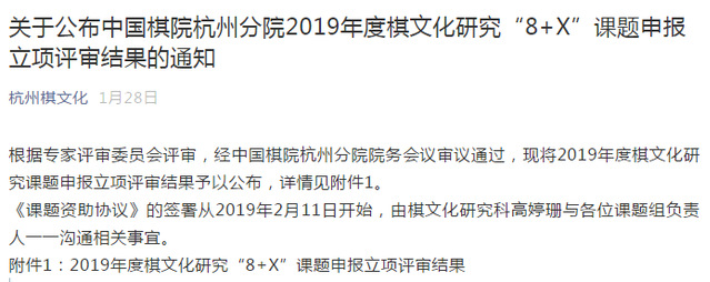 日前,根据专家评审委员会评审,经中国棋院杭州分院院务会议审议通过,公布2019年度棋文化研究课题申报