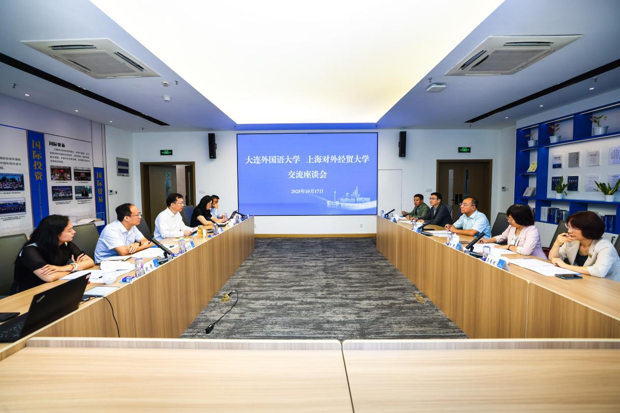 正值上海对外经贸大学建校65周年之际,10月17日上午,大连外国语大学校长丛明才一行来访学校长宁校区,向上经贸大65周年校庆致以热烈祝贺,并开展专题调研交流。校长汪荣明出席活动并主持座谈会。汪荣明对丛明才一行来访表示欢迎和感谢。他回顾了学校65年来服务国家对外开放战略的办学历程,介绍了我校在学科建设、人才培养和智库研究等方面的特色优势。他表示,当前学校正全面推进以“重服务、强贡献”为目标导向的综合改革,聚焦国际经贸创新与治理、国际金融与国际投资、数字管理与智能决策等重点领域,系统深化人才供给侧结构性改革。他指出,大连外国语大学作为东北地区外语教育的重镇,长期以来在服务国家对外语言战略、培养复合型国际化人才方面形成了鲜明特色。他希望,以此次交流为契机,与大外携手探索特色型高校的发展新路径,在学科共建、人才共育等方面深化合作,共同服务国家战略与区域发展需求。丛明才代表大连外国语大学向学校建校65周年致以热烈祝贺,并对学校的周到安排表示感谢。他介绍了大连外国语大学的基本概况、发展特色优势和深化教育综合改革情况。他对于学校开放型经济学科群建设、高层次国际化人才培养和智库服务等方面的创新实践表示