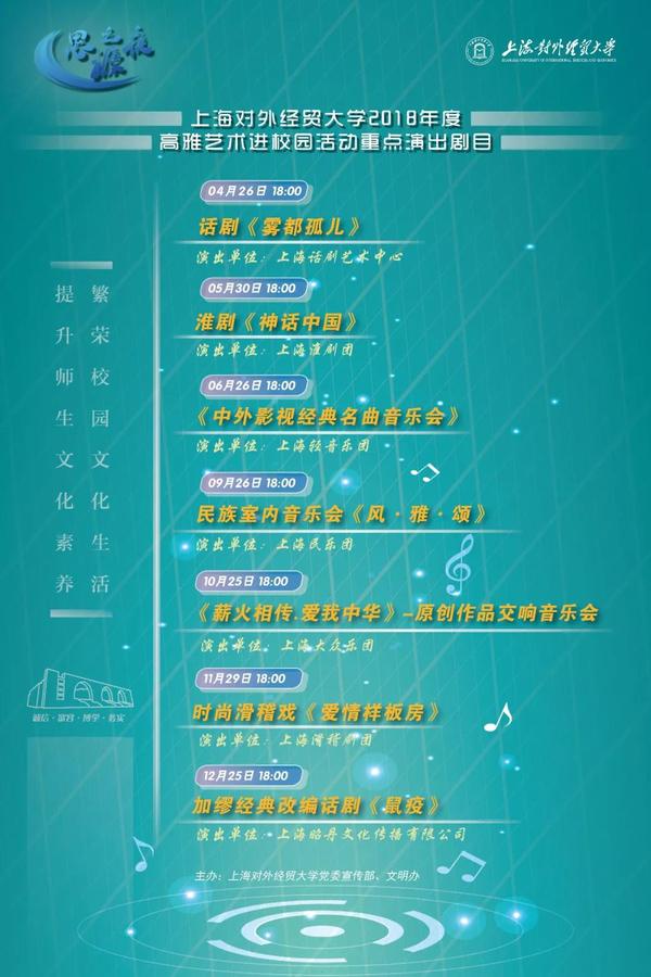 2018年度“思源之夜”高雅艺术进校园系列活动由校党委宣传部、文明办主办,活动旨在提升师生文化素养,繁荣校园文化生活。除了本场演出,2018年“高雅艺术进校园”系列活动还安排了淮剧《神话中国》、《中外影视经典名曲音乐会》、民族室内音乐会《风、雅、颂》、《薪火相传、爱我中华》——原创作品交响音乐会等系列演出,让师生近距离感受高雅艺术的魅力。