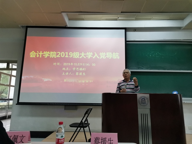 行程万里,初心不忘。会计学院10月9日下午在学思楼A1召开新生入党导航教育讲座活动,邀请关心下一代工作委员会蔡援生同志通过分享读党章、学党史的心得体会,带领新生回顾了中国共产党的初心使命,鼓励同学们积极向党组织靠拢,端正入党动机,将小我融入大我,把青春献给党,为实现“两个一百年”奋斗目标和中华民族伟大复兴贡献自己的一份力量。10月12日,会计学院2019级新生开学第一堂团课在学思楼A1正式开课,通过唱团歌、学团史和重温入团誓词等环节,进一步提高团员的思想理论水平和政治素质。