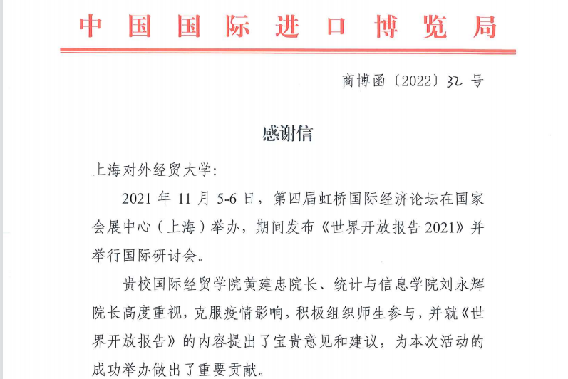 近日,学校收到中国国际进口博览局寄来的感谢信,对国际经贸学院黄建忠院长、统计与信息学院刘永辉院长表达诚挚谢意。信中指出,2021年11月5-6日,第四届虹桥国际经济论坛在国家会展中心(上海)举办,期间发布《世界开放报告2021》并举行国际研讨会。我校黄建忠院长、刘永辉院长高度重视,克服疫情影响,积极组织师生参与,并就《世界开放报告》的内容提出了宝贵意见和建议,为活动的成功举办做出了重要贡献。中国国际进口博览局也对我校给予的大力支持表示感谢,并希望我校对虹桥国际经济论坛继续保持关注和支持。