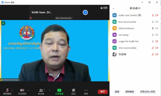 齐佳音对两所大学代表团云端赴会表示热烈欢迎,并向柬方代表团介绍了我方与会人员。外事处戴凌洁向柬方代表团介绍了上海对外经贸大学的专业建设、招生就业、国际合作等情况,齐佳音介绍了人工智能与变革管理研究院的发展历程、研究方向,并重点介绍了教研团队在新商科开放创新方面的探索与实践,建议基于新商科开放创新数字化服务平台开展人才培养的合作设想。