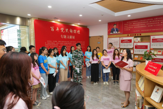 最后,乔檀在活动总结中讲到,本次活动是学校面向新生开展的一次别开生面的移动党课,依托“三全育人”,将党史学习教育融入新生入学教育,帮助新生做到“学史明理、学史增信、学史崇德、学史力行”。她以“三个学”勉励新生:一是系统全面学,希望同学们充分使用好图书馆丰富资源,全面系统地学习百年党史;二是深入思考学,结合习近平总书记“七一”重要讲话精神,尤其是对青年寄语,坚持在学习中加强领悟,从党史中汲取奋进力量;三是联系实际学,落脚于学史力行,在知行合一、学以致用上下功夫,争做新时代有为青年。
