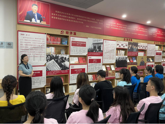活动伊始,在讲解员马克思主义学院研究生党员彭鹏、法学院本科生程先珏地介绍下,新生们依次参观了“百年党史铸辉煌”专题文献展的“党的建设、统一战线、经济、文化、法治、人物、军事、外交”8个篇章,通过图文并茂的展示,集中感受了100年来党所取得的伟大而辉煌的成就。