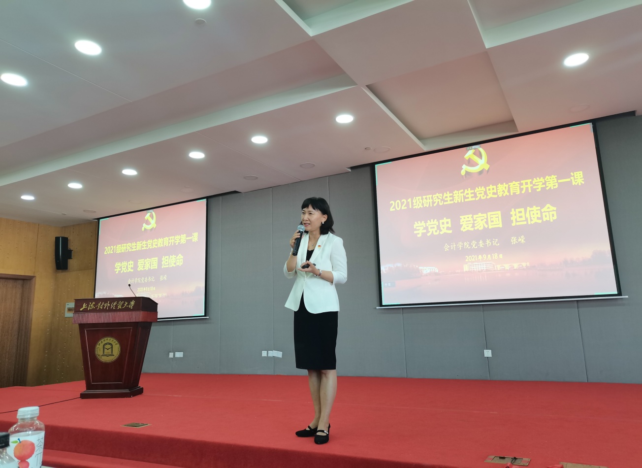 近日,会计学院面向2021级148名研究生新生开展党史学习教育,会计学院党委书记张嵘为同学们带来题为《学党史爱家国担使命》的开学第一课。