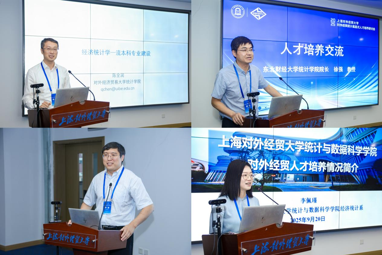 对外经济贸易大学统计学院经济统计系主任陈全润教授、东北财经大学统计学院院长徐强教授、中国人民大学统计学院院长李扬教授、上海对外经贸大学统计与数据科学学院经济统计系主任李佩瑾副教授分别就学院对外经贸人才培养模式进行解读。会上,各高校专家、行业嘉宾对加强对外经贸人才培养模式的改革创新进行了交流探讨。