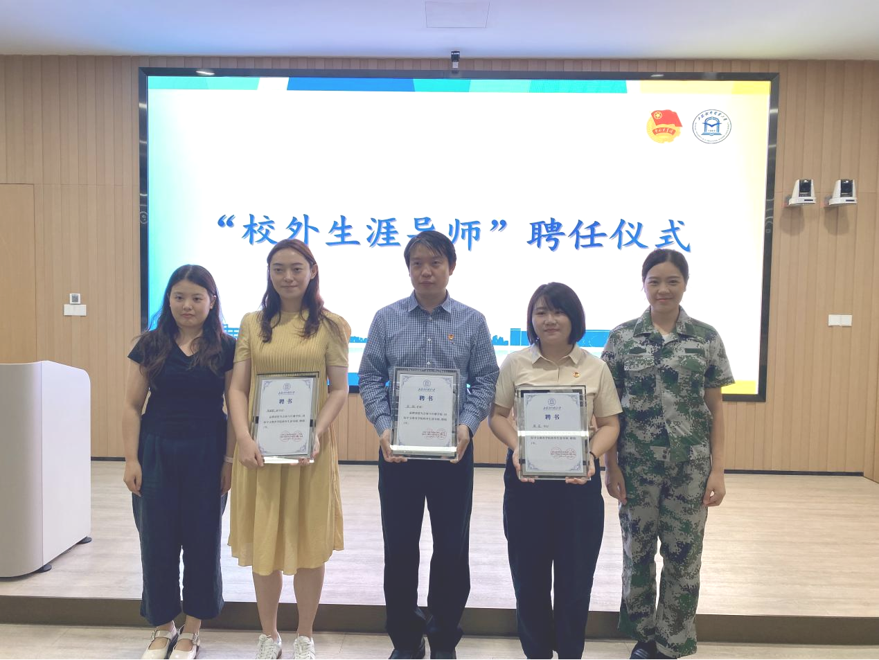 虞娅娜、张艺伟代表国际中文教育学院和会展与传播学院就业育人工作站,向吴一烜、张艺、须雨虹颁发“校外生涯导师”聘书。卢毅聪回顾了本年度“扬帆计划”“返家乡”等项目参与同学的实践情况。