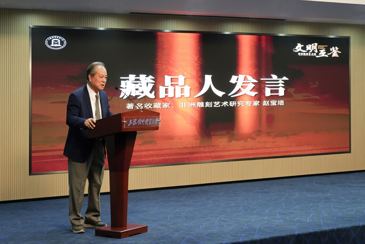 赵宝培在发言中表示,常听到“中国人在非洲雕刻上是个晚到者”这个说法,历史原因造成了这一局面。如今,随着中华民族重返世界舞台中心,研究欧美艺术如何从非洲雕刻中汲取养分并建立领先优势,已成为我们必须重视的课题。作为改革开放后赴非的第一代中国人,他回国后编著了国内第一部由中国人介绍非洲雕刻艺术的书籍——《变形之美》。他特别感谢上海对外经贸大学为此次展览提供了高水平的平台,让这些珍贵的非洲艺术得以与公众见面。他激动地表示:“我始终坚信,既然‘非’可为‘欧’用,相信‘非’一定能为‘中’用。”他期望此次展览能成为一个起点,启发更多中国学者和艺术家从非洲雕刻中汲取养分,为中国艺术的发展带来影响。
