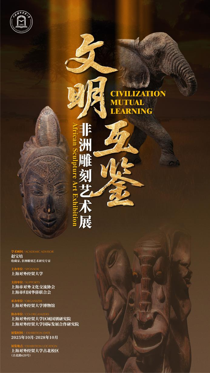 “文明互鉴——非洲雕刻艺术展”于2025年10月至2028年10月在上海对外经贸大学长宁校区持续展出。展览通过百余件非洲雕刻精品的实物展陈、图文解说等形式,旨在向社会公众展示非洲文明的多样性与独特魅力,增进中非人民之间的相互了解和友谊,为推动构建更加紧密的中非命运共同体贡献力量。
