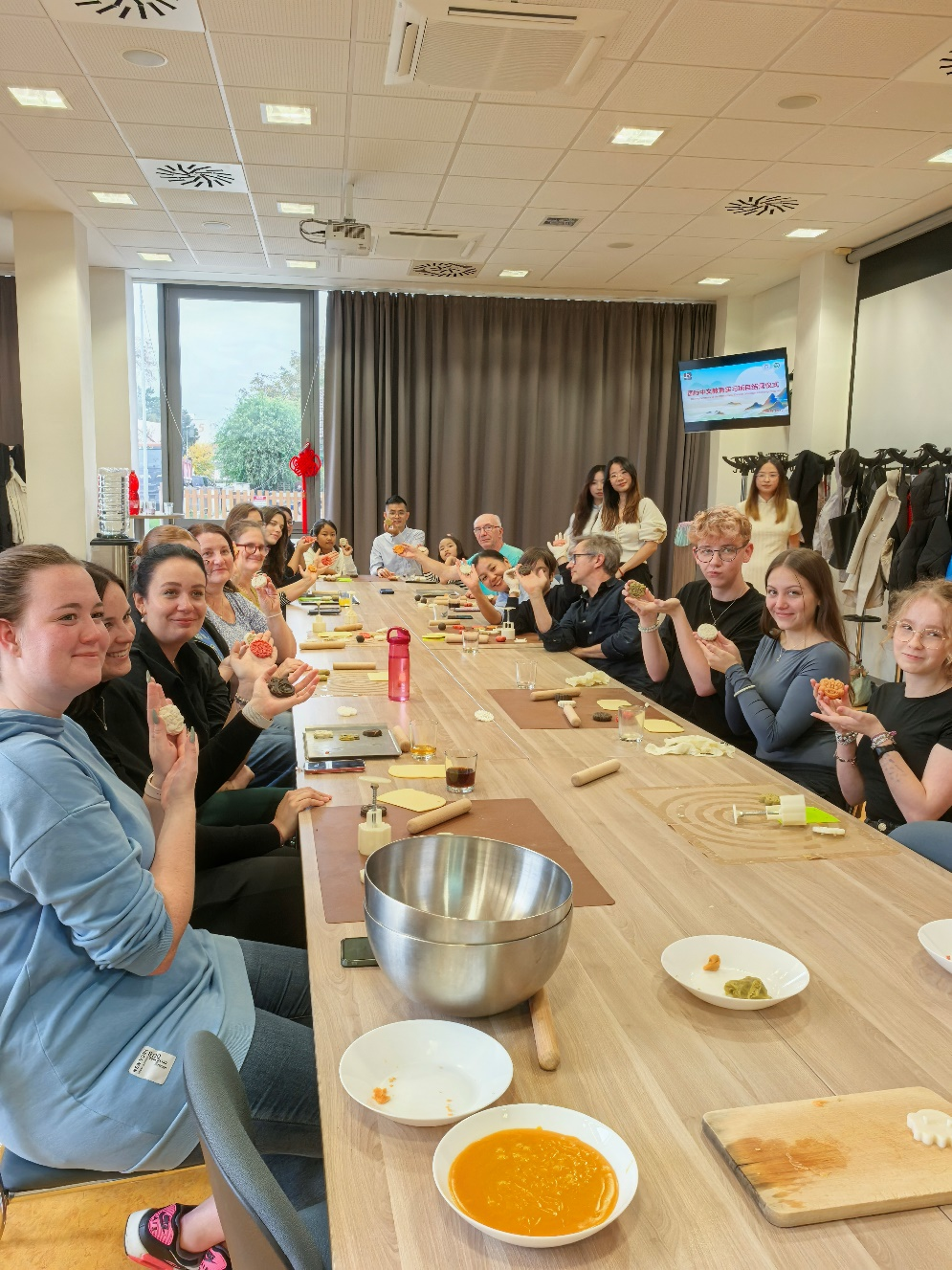 9名参与实践项目的学生还走进布杰孔堂,开启了“月饼工坊”文化盛宴,为实习旅程画上温馨句点。主讲同学为孔堂学员们讲述月饼的来历与寓意,从“嫦娥奔月”的传说到中秋团圆的期盼,再延伸至中国传统寓言故事,把文化的种子播撒在大家心间。工坊里,孔堂为同学们准备了多样口味的月饼皮和馅料,供大家自由搭配。制作步骤看似简单:将月饼面团揉成均等圆球,压扁裹馅,再用模具压制。但初次接触的学员们难免手忙脚乱。9位来自中国的“小助教”便化身文化使者,手把手教学,耐心解释制作原理。当一个个印有“中秋”“团圆”字样,刻着嫦娥、月亮、兔子图案的精巧月饼从模具中诞生,学员们的惊喜溢于言表。活动最后,大家手持自己的月饼作品合影留念。