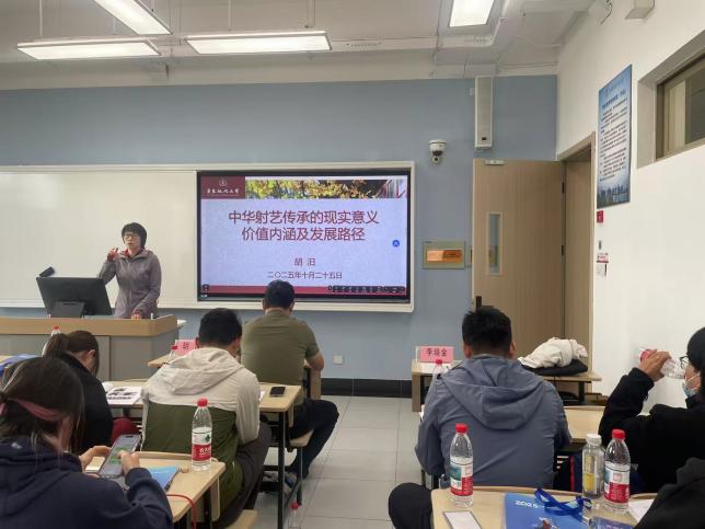 在理论课程中,两位专家引导学员们超越单纯的技能学习,深入射艺的精神内核。张波阐述了射艺在当代体育教育中的独特价值。他表示,射艺是“体育”与“德育”完美结合的载体。从“基本技术”的锤炼到对文化内涵的领悟,是一个由外而内的修养过程。古代“射以观德”不仅是个人修养的体现,更是选拔人才、报效国家的重要途径,这种“内志正,外体直”的精神追求与当今培养学生责任感、规矩意识和爱国精神的目标高度契合。胡汨则从历史与哲学的维度,对射艺的文化谱系进行了精妙梳理。他详解了“礼射”的丰富内涵,如“君子无所争,必也射乎”的竞争观,“揖让而升,下而饮”的礼仪规范。他强调,射艺的技术传承,本质上是中华礼仪文明与处世哲学的传承。教学的核心不仅是教会学生如何射中靶心,更是引导他们在“发而不中、反求诸己”的反思中,学会自我观照与人格完善,从而实现从“术”到“道”的升华。