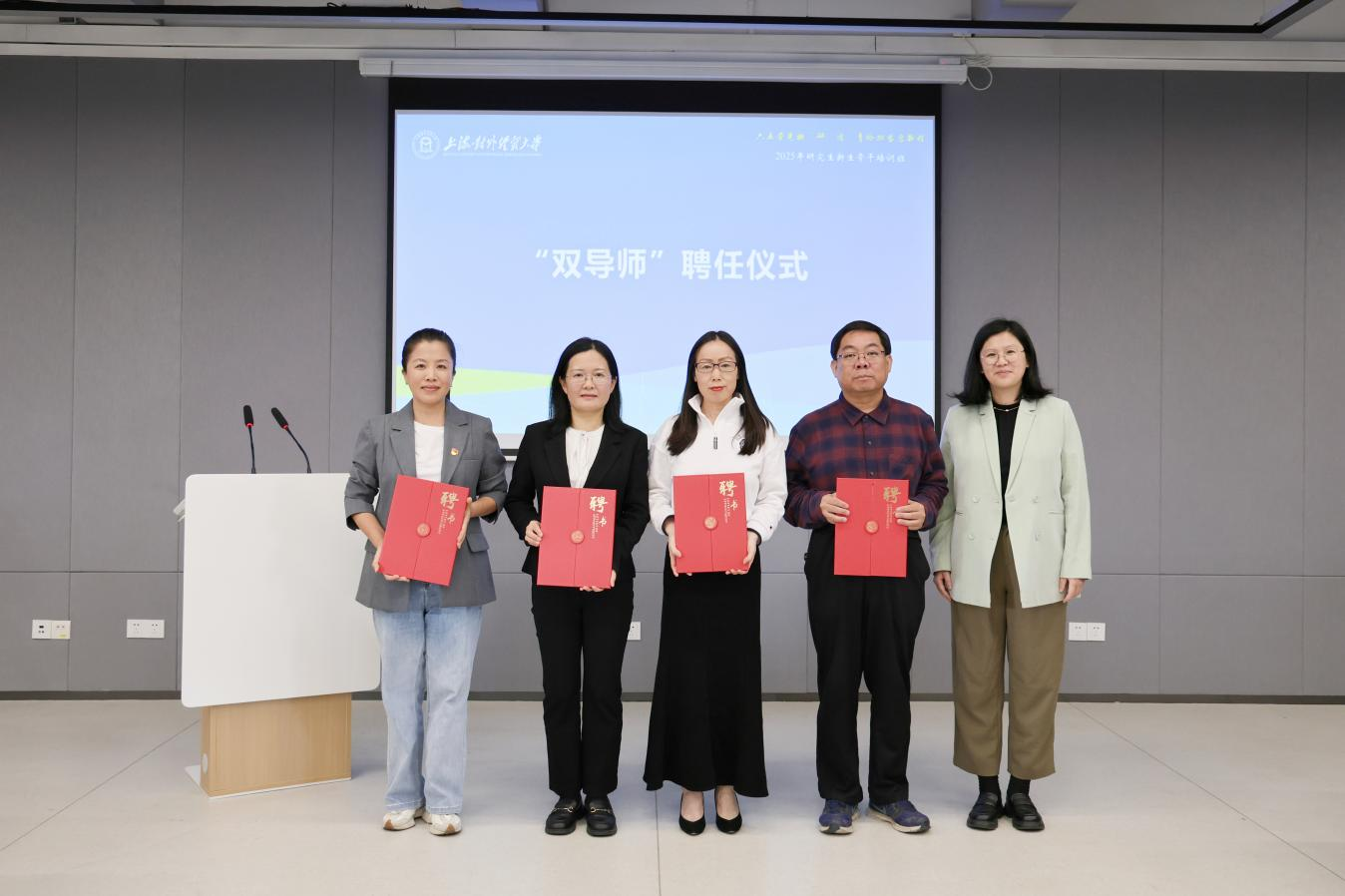 研究生院常务副院长郝程程为2023年度校“优秀研究生导师”、金融管理学院副院长郑迎飞教授,2024年度校“优秀研究生导师”、国际经贸学院洪江涛教授,2023年度校“优秀研究生导师”、工商管理学院左鹏教授,2023年度校“优秀研究生导师”、统计与数据科学学院方艳教授颁发“学科导师”聘书。