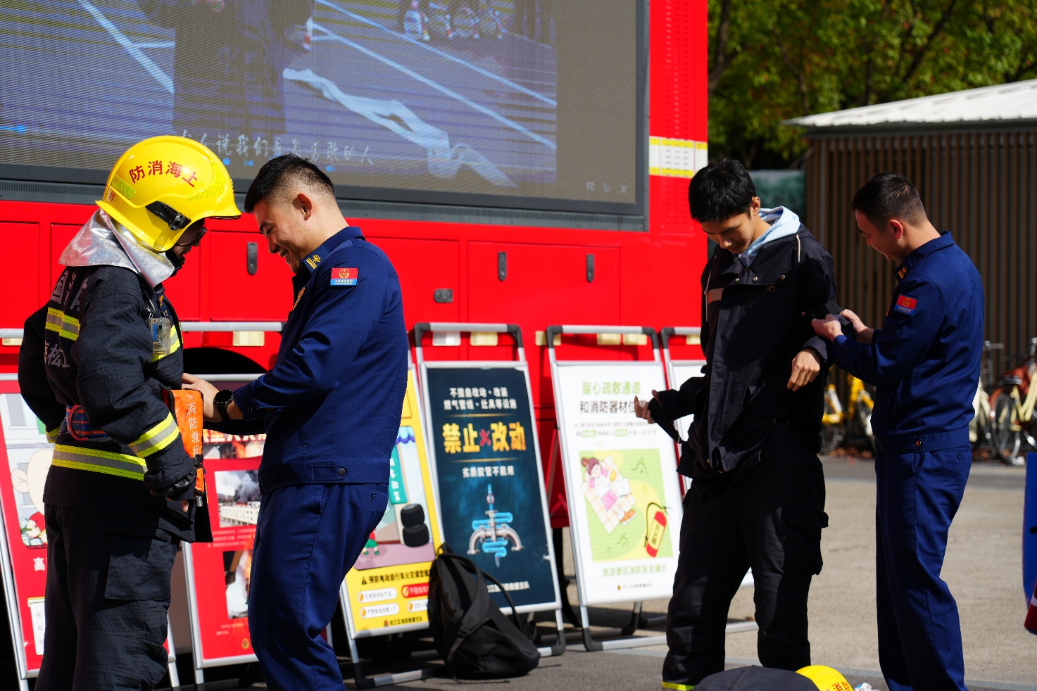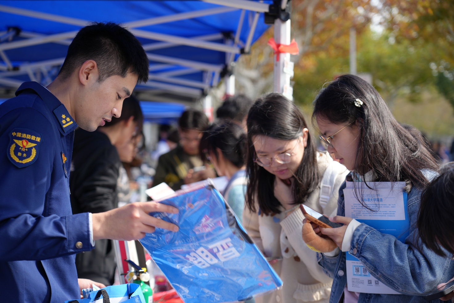 在消防实战体验区,消防员指导师生试穿消防战斗服,通过亲身体验,师生深刻感受到消防员在执行任务时的艰辛与担当。现场还设置了消防应急装备展示区,消防员系统讲解了灭火毯、消防火灾逃生面具等器材的使用方法与操作原理,并结合高校宿舍常见的用电安全隐患,详细阐述了火灾预防与紧急自救的关键知识。此外,消防主题文创礼品将安全教育与日常生活相结合,进一步提升了宣传的实效性和覆盖面。
