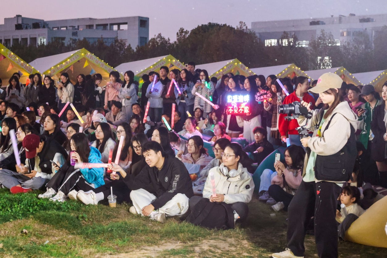 “下课后我听到音乐声就过来了,发现思源湖畔舞台的灯光已经被点亮,同学们或坐在草坪上挥舞着荧光棒,或驻足围观停留一起歌唱,这简直就是校园生活里掉落的小惊喜。”湖面映照着橘色的夕阳,校园在霞光中显得格外浪漫,有同学这样说道。天清气朗,气氛正恰到好处。