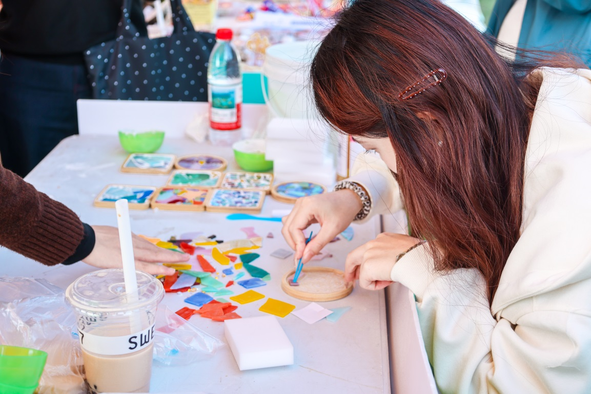 秋日的阳光正好,暖意融融。当日中午12点起,湖畔的文化市集就开幕了——14个特色摊位栉比相邻,集中呈现了文创产品、非遗技艺、美食茶饮等项目。把“市集”搬进校园,师生成为“赶集人”,上海对外经贸大学的“一月一市集”,已成为校园文化品牌活动。