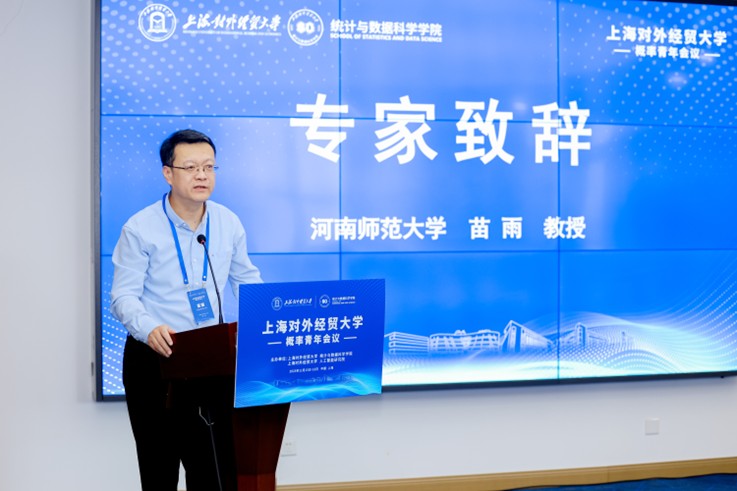 河南师范大学副校长苗雨教授作为嘉宾代表在开幕式上致辞。他表示,近年来上海对外经贸大学统计与数据科学学院在夯实学生数理基础、弘扬严谨求实科学精神方面取得了显著成效,统计学科发展在国内享有良好声誉,在国际上产生了广泛影响。他强调,概率论作为现代统计学的理论基石,不仅是统计思想体系的核心组成部分,更是推动统计学理论创新与学科发展的源头活水。此次会议的举办,充分体现了上海对外经贸大学在学科战略布局上的前瞻性与引领性,有助于进一步促进多学科之间的深度融合与协同发展。