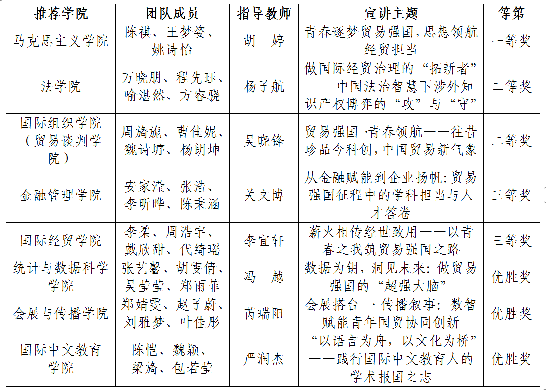 此次大赛是一堂专业导向突出学科交叉融合的思政大课,激励广大学生立足专业所学,将个人理想熔铸于民族复兴的壮阔征程,在服务国家战略中勇担先锋使命。未来,党委学(研)工部、研究生院将持续创新思政育人模式,对标国际经贸创新与治理、国际金融与国际投资、数字管理与智能决策等重点领域人才培养目标,着力构建“有高度、有温度、有深度”的沉浸式教育场景,让习近平新时代中国特色社会主义思想真正成为青年成长成才的思想灯塔和行动指南,切实转化为学思用贯通、知信行统一的青春实践。