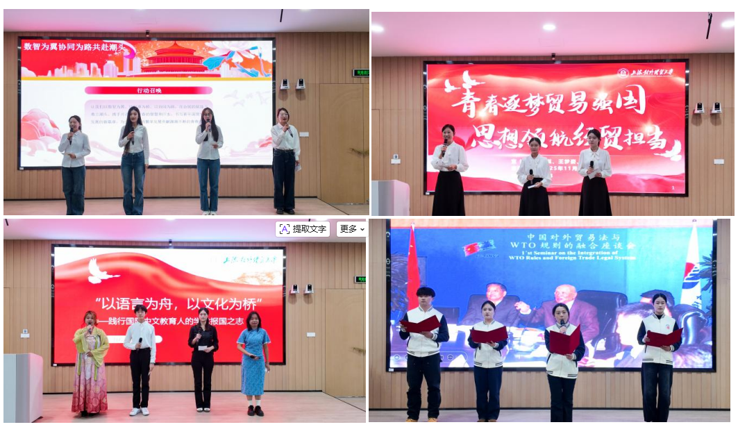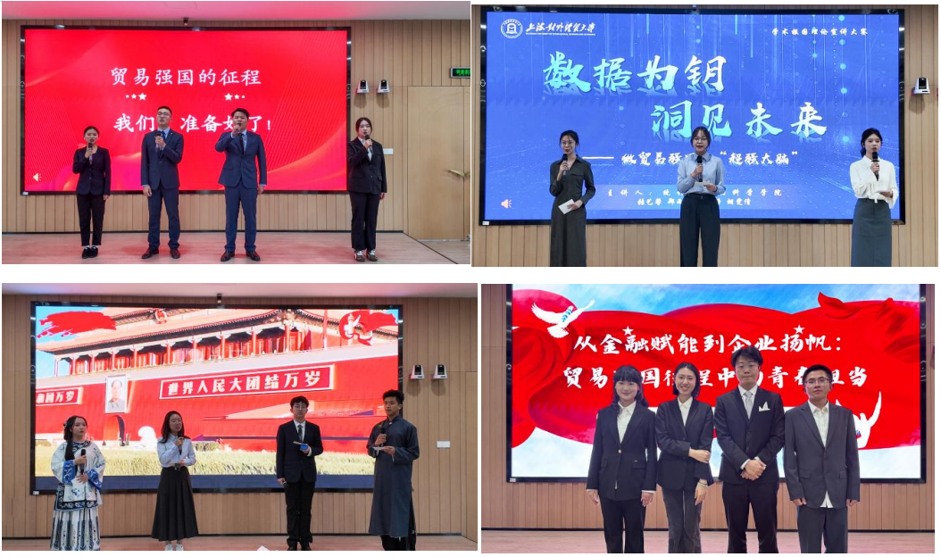 经学院推荐、书面评审,共有8支队伍从22支队伍中脱颖而出。展示环节,8支队伍同台竞技,借助情景演绎等形式,围绕贸易强国、金融报国、文化传播等时代命题,结合学院学科专业特色展开宣讲,主题鲜明、视角独特,生动诠释了“把论文写在祖国大地上”的学术追求与报国热情。
