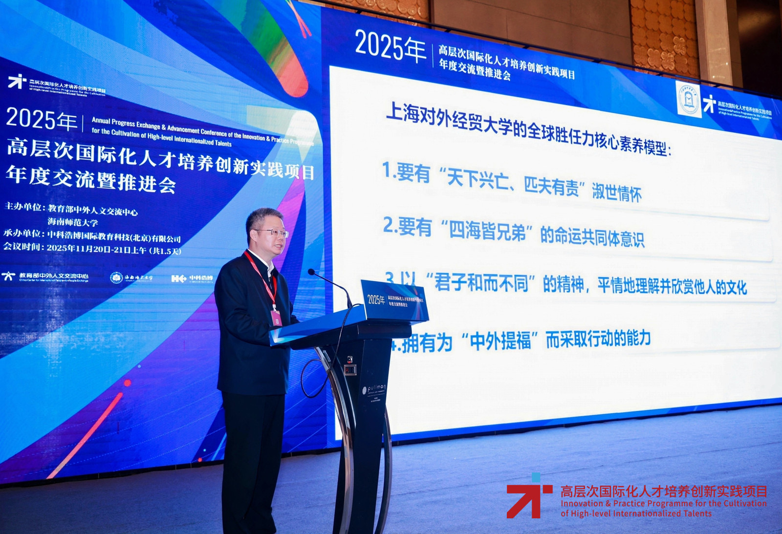 11月20日至21日,由教育部中外人文交流中心主办、海南师范大学联合主办的“2025年高层次国际化人才培养创新实践项目年度交流暨推进会”在海南海口举办。教育部相关司局和有关单位领导、地方教育行政部门领导、高等院校和中学领导及项目负责人,相关领域专家、学者、从业人员,以及国际组织代表等86家单位180名嘉宾出席本次活动。会议对项目院校、专家及个人进行了表彰。上海对外经贸大学与厦门大学、天津大学、华东师范大学、中央财经大学、上海外国语大学、中国传媒大学等20所高校荣获“高层次国际化人才培养创新实践项目“优秀院校。