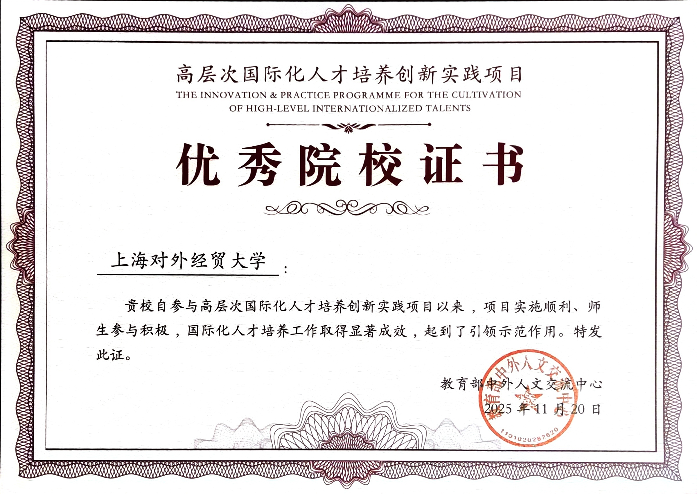 上海对外经贸大学于2020年入选教育部中外人文交流中心首批“高层次国际化人才培养创新实践基地”。项目实施以来,学校累计2300余人次学生参与“高层次国际化人才培养创新项目”的线上课程学习,290余人获得由教育部中外人文交流中心颁发的课程证书。