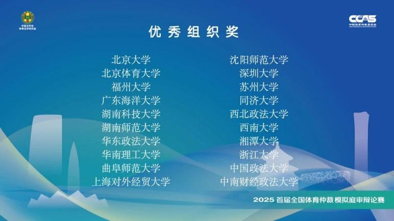 时值第十五届全国运动会火热举办、全民体育热情高涨之际,我校法学院代表队在体育仲裁模拟庭审辩论赛的赛场也传来捷报。11月15日至16日,首届全国体育仲裁模拟庭审辩论赛在深圳国际仲裁院举行。我校代表队从全国59支队伍中脱颖而出,一路过关斩将摘得全国季军。同时,学校荣获“优秀组织奖”,指导教师柳菲菲荣膺“优秀指导教师”,参赛队员张竞予同学获评“最佳辩手”,实现了赛事成绩与荣誉表彰的全面丰收。新华社等权威媒体对本次大赛进行了深度报道,进一步彰显了赛事的专业水准与社会影响力。