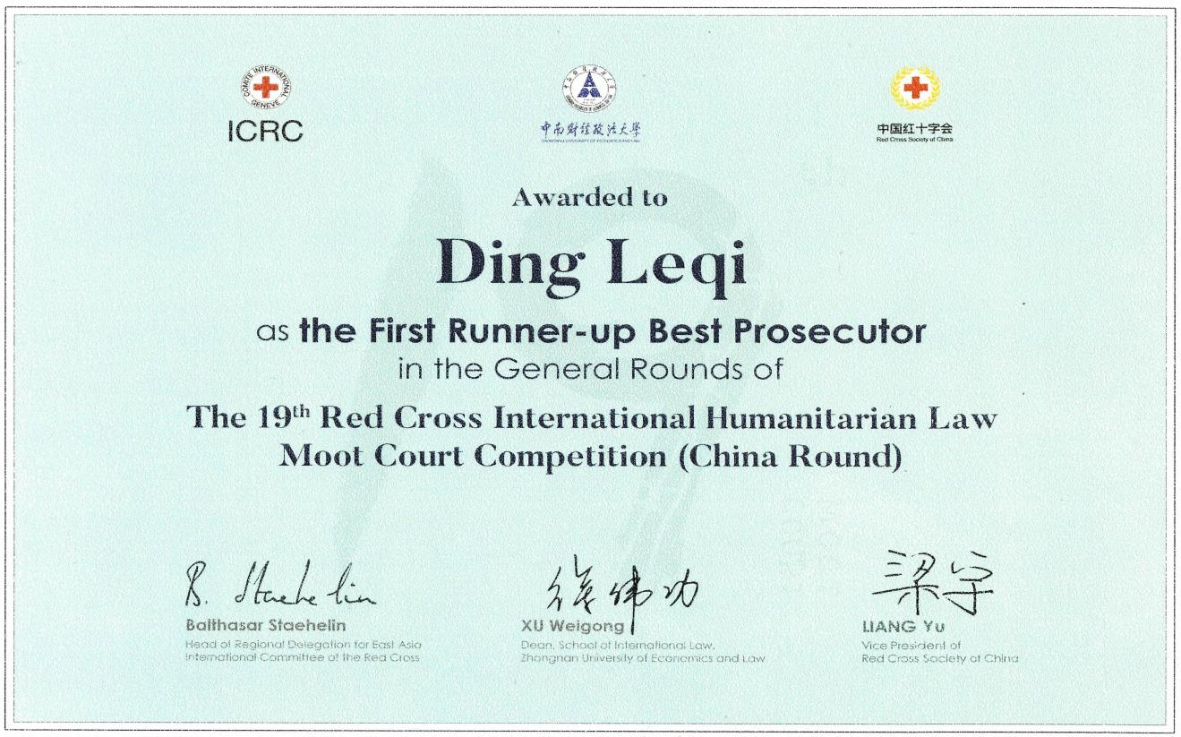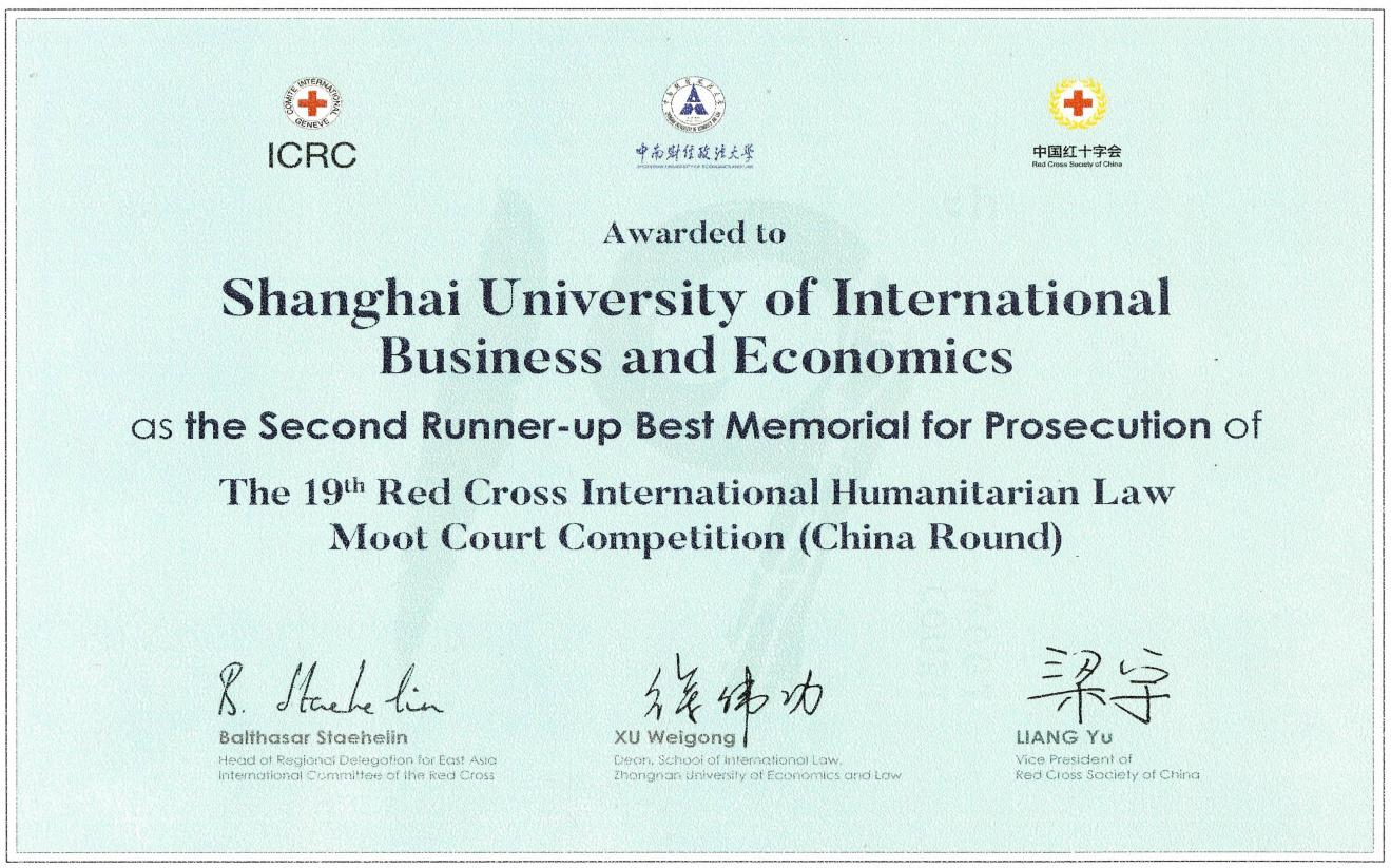 11月21日至23日,由红十字国际委员会、中南财经政法大学和中国国际人道法国家委员会秘书处共同主办的第十九届中国大陆地区红十字国际人道法模拟法庭竞赛在湖北武汉举行。74所中国高校报名参赛,规模为历届之最。我校代表队以初赛第二名的优异成绩,与中国政法大学、中南财经政法大学、北京外国语大学、华东政法大学、山东大学(威海)、南开大学、山东大学共同获得全国一等奖,同时荣获控方最佳书状奖,丁乐祺同学在近200名参赛选手中摘得“最佳检察官”称号。