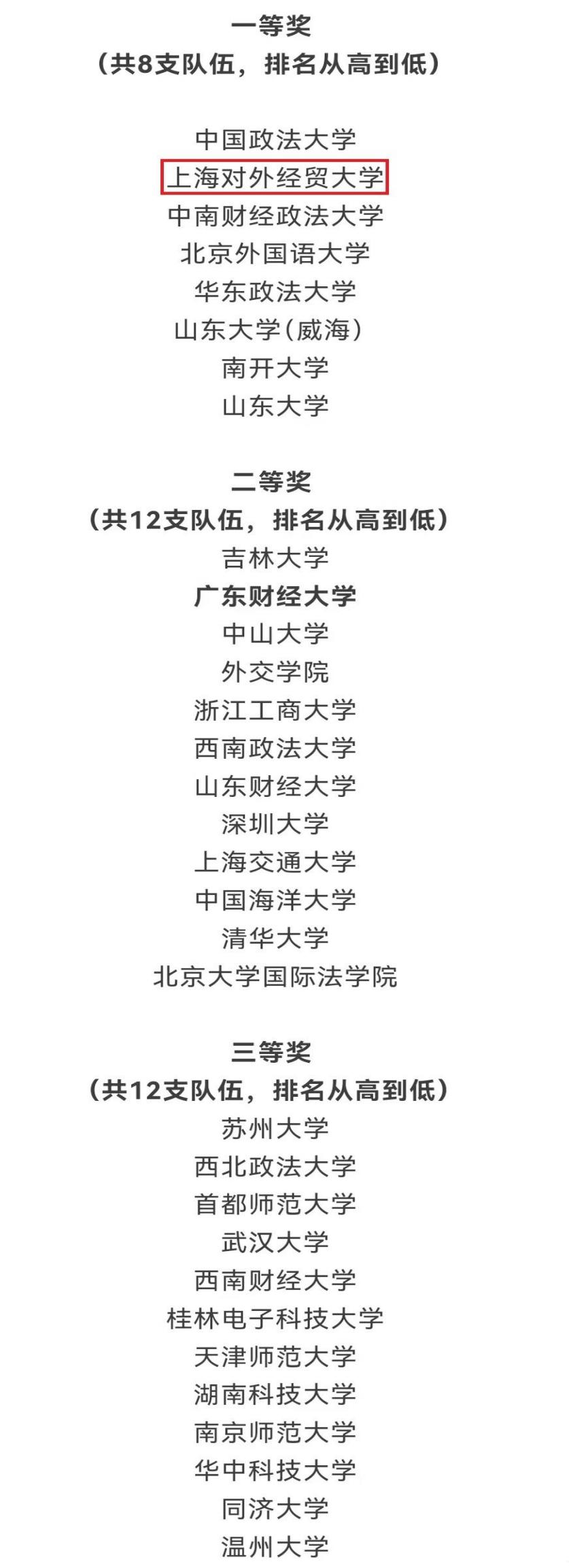 法学院以法学专业入选国家一流本科为契机,依托教育部涉外法治人才协同培养创新基地、上海高校涉外法治人才教育培养基地等平台,把高水平国际模拟法庭竞赛作为锻造高端涉外法治人才的重要举措。近五年荣获国际刑事法院模拟法庭英文赛全国冠军、中国国际海洋法竞赛全国冠军、杰赛普“全球最佳综合书状奖”及全国一等奖(3次)、法兰克福国际投资仲裁竞赛全国一等奖等50余项国家级、国际级奖项。法学院将继续“以赛促学”为引擎,推进课程改革、赛训融合、人才培优,不断探索新时代涉外法治人才培养的路径,为国家的高水平对外开放和法治中国建设贡献上经贸大的智慧与力量。
