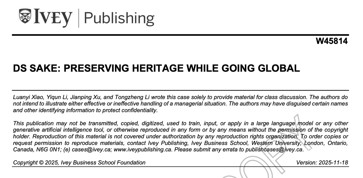 近日,我校国际商务外语学院肖鸾仪博士作为第一作者及通讯作者开发的案例《DS SAKE: Preserving Heritage While Going Global》由国际著名案例机构——毅伟案例库(Ivey Publishing)正式收录并作全球出版发行。毅伟案例库是全球商业案例库高质量标准的象征,此案例为国际商务外语学院首篇入选该权威案例库的成果,实现了在国际高水平案例建设上的历史性突破。