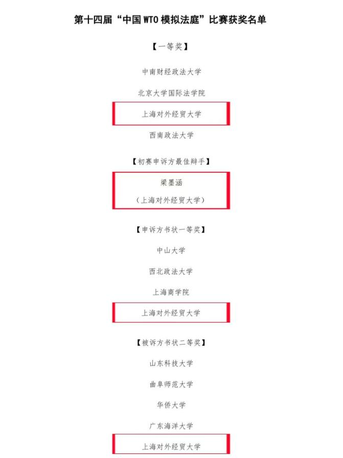 近日,第十四届“中国WTO模拟法庭”竞赛(China WTO Moot Court Competition)在西南政法大学顺利举行。经过书状评审、线上初赛、线下多轮角逐,我校代表队从全国66支高校队伍中脱颖而出,与北京大学、中山大学、山东大学、西南政法大学、北京外国语大学等十所院校共同斩获团体全国一等奖以及申诉方书状一等奖和被诉方书状二等奖,其中2024级国际经贸规则专业梁墨涵获得初赛申诉方“最佳辩手”的荣誉,充分展现了我校在WTO法领域的人才培养实力。
