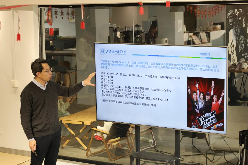为深入推进“三全育人”综合改革,扎实推进“一站式”学生社区建设走深走实,打通育人工作“最后一公里”,助力学生拓宽学术视野、锤炼辩证思维,12月17日,国际经贸学院在松江校区“一站式”学生社区成功举办题为《如何理解经济学中的悖论》的学术讲座。本次讲座由国际经贸学院焦振华教授主讲,以投票悖论、阿莱悖论、圣彼得堡悖论三大经典议题为核心,用生活化案例拆解抽象理论,带领同学们走进经济学的“反常识”世界,实现专业教育与价值引领同频共振。
