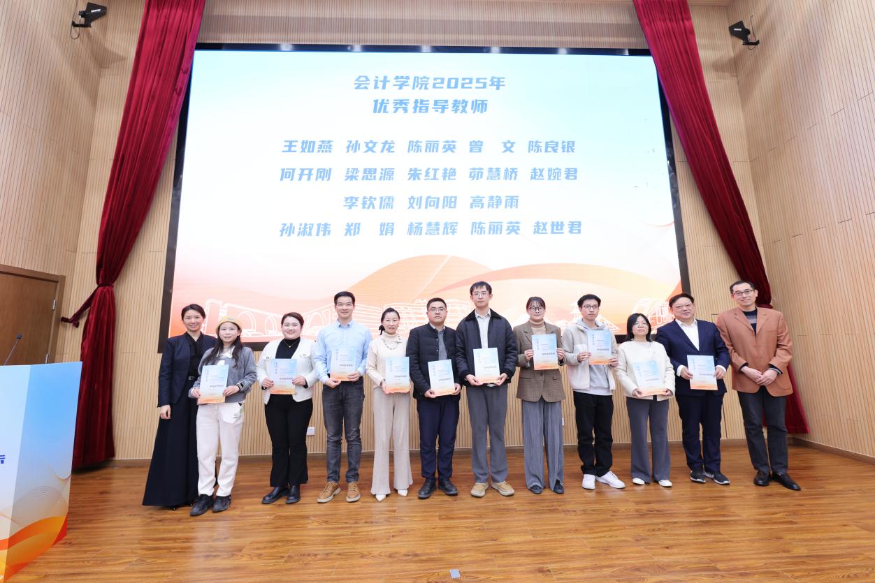 缪韵笛向获奖个人和团队表示祝贺,对指导老师的辛勤付出表示感谢,并充分肯定了学院2025年度实践育人成果。她以会计学院师生的“三种样子”与全体师生共勉:一是坚定“四个自信”、投身“中国之治”,在党建引领下通过实践感悟新时代成就;二是锤炼实干担当、深化“一线建功”,师生深入新疆、贵州等地,在矿区转型、非遗传承等领域调研奉献;三是敢于开拓创新、推动“新质发展”,学院立足“为科服务,为产育人”,在数字治理、智慧财务等前沿领域探索,以产教融合培养具有国际视野与家国情怀的新时代经贸人才。