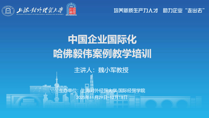 随着国际国内形势的不断变化以及数字化技术的快速发展,我国对外贸易和对外投资领域发生了重大变化。外贸新业态新模式不断涌现,国际投资从外商直接投资为主转为大量中国企业对外投资。11月29日至12月18日,上海对外经贸大学国际经贸学院特邀加拿大阿尔格马大学魏小军教授,以“中国企业国际化”为主题,开展案例开发与案例教学系列培训。此次专题培训也是适应当前企业“走出去”的人才需求,从人才培养供给侧主动改革的重要举措。
