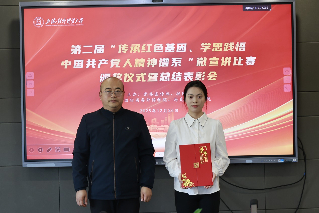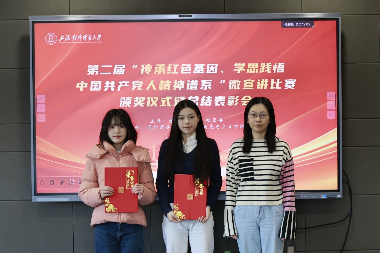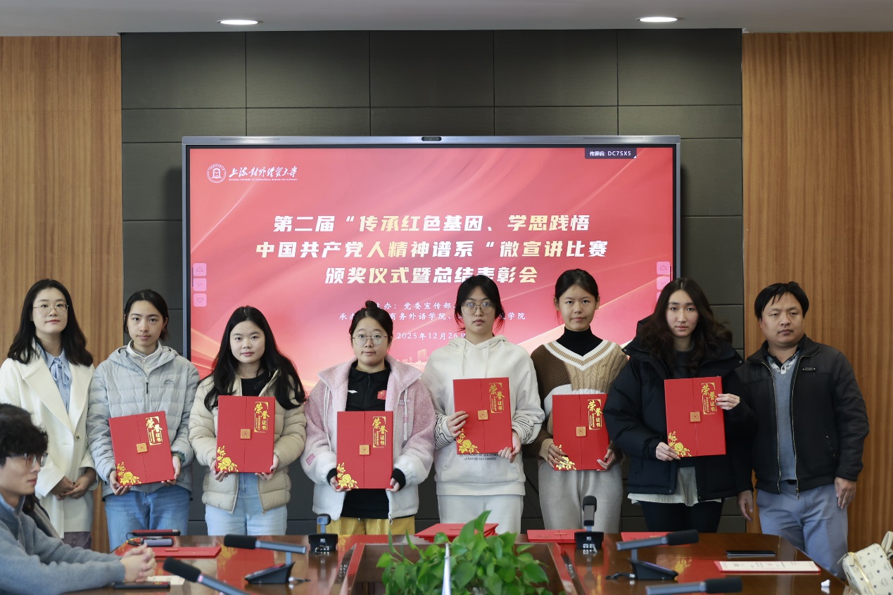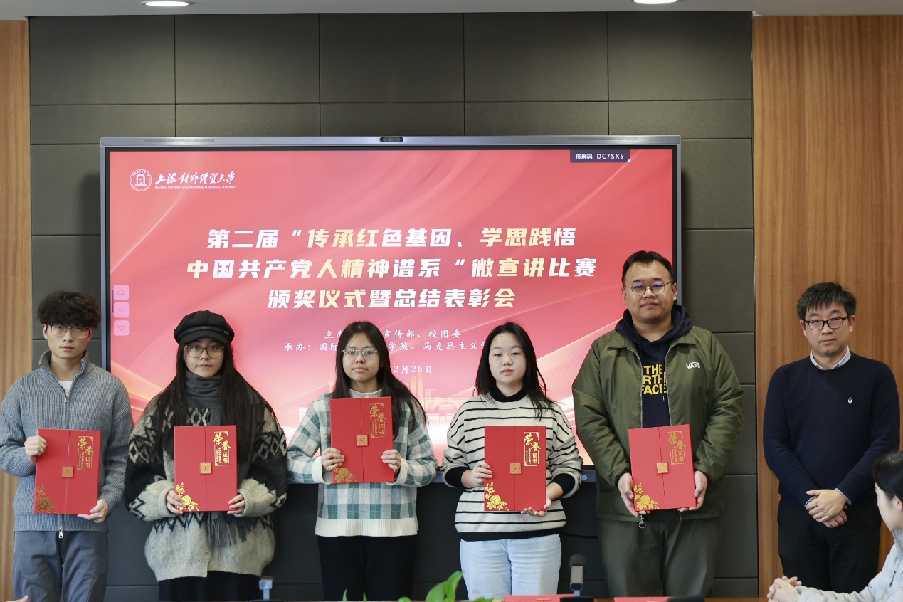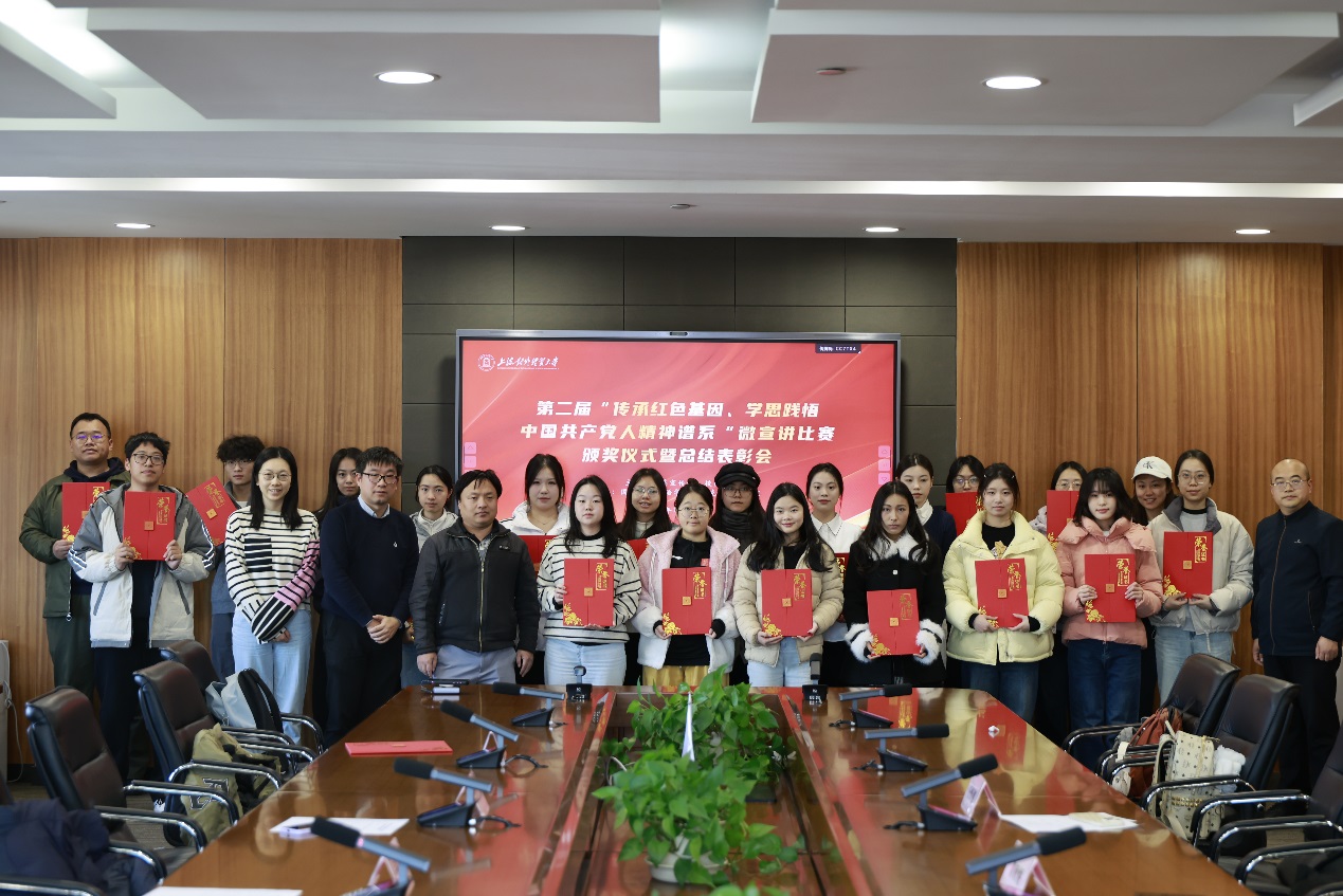 12月26日下午,第二届“传承红色基因、学思践悟中国共产党人精神谱系”微宣讲比赛颁奖仪式暨总结表彰会在松江校区德政楼317会议室举行。校党委宣传部副部长张帅、校团委书记司徒力云、马克思主义学院和国际商务外语学院师生代表以及微宣讲比赛获奖学生参加总结表彰会。
