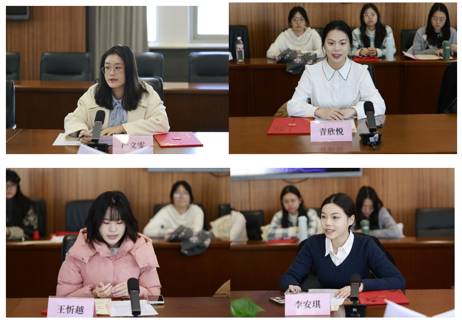 会上,国际商务外语学院严文雯作为赛事承办单位回顾了本次比赛总体情况。赛事一等奖获得者马克思主义学院青欣悦同学、二等奖获得者国际商务外语学院王忻越同学和马克思主义学院李安琪同学分别作了交流发言,讲述了参加本次比赛的心路历程,分享了收获感悟。
