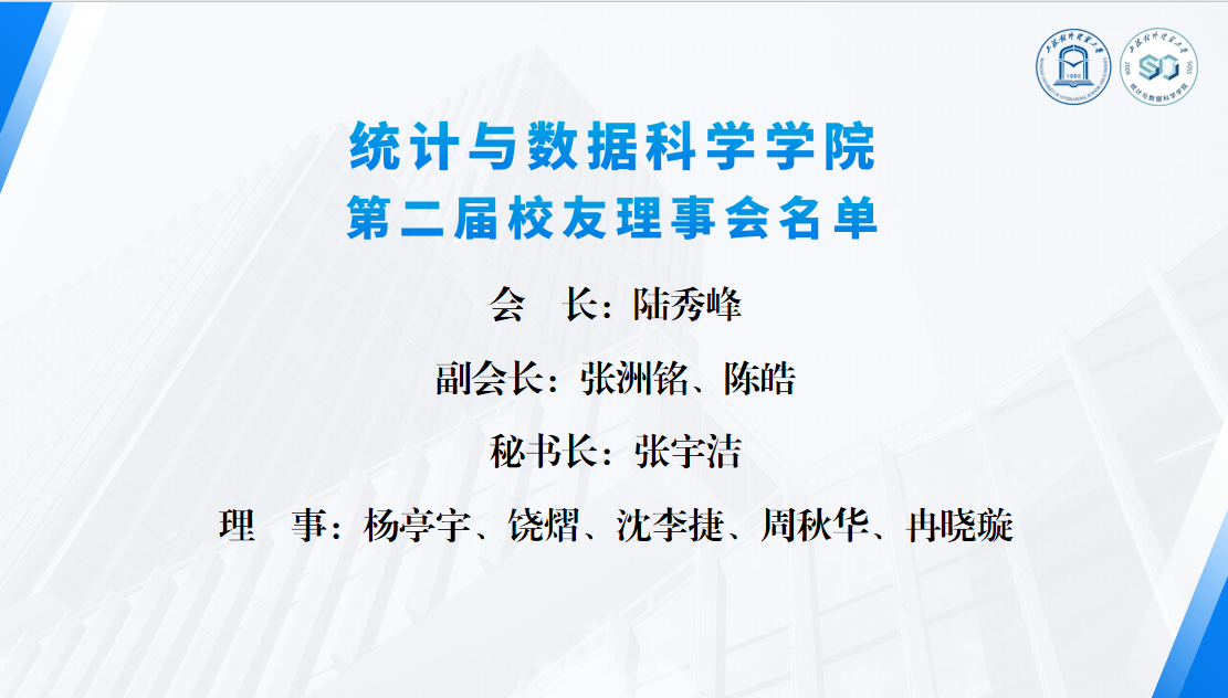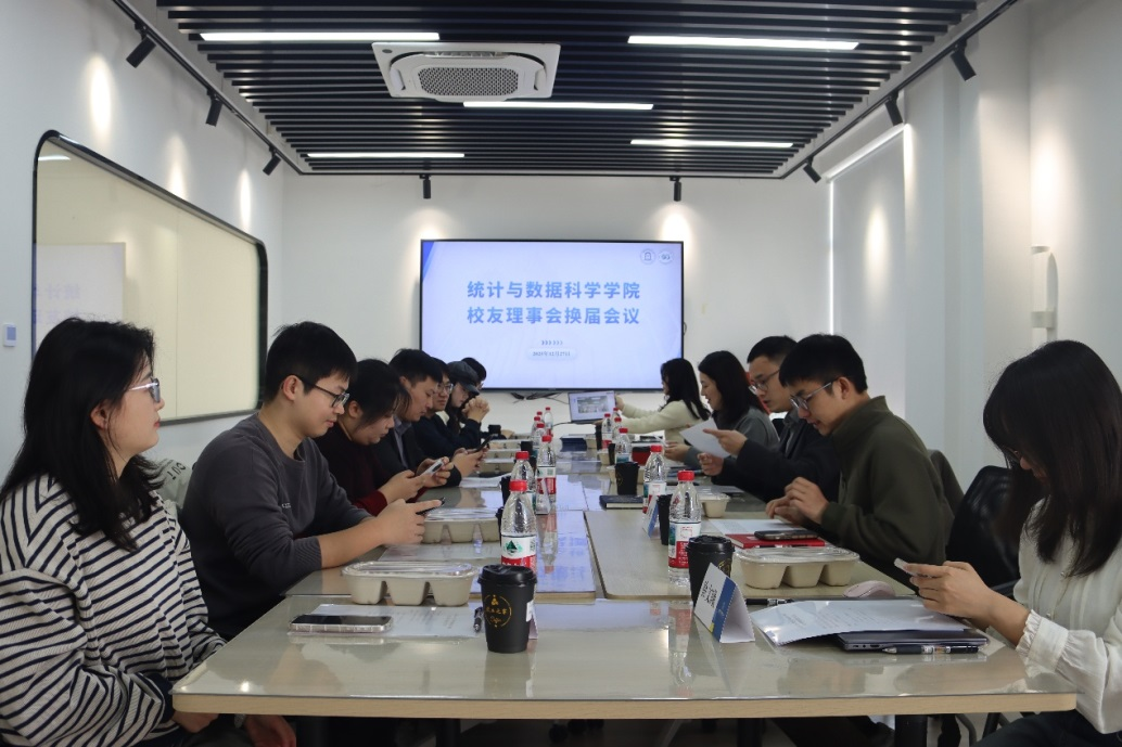 2025年12月27日下午,上海对外经贸大学统计与数据科学学院校友理事会换届会议在松江校区乐群楼教工之家会议室顺利举行。统计与数据科学学院党委书记黄静、党委副书记范鸣、校友工作负责老师岳怡寒、团委书记彭鹏、团委副书记徐文曦与校友代表参加会议。会议由范鸣主持。