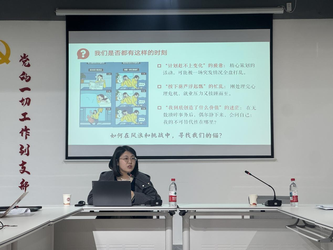 为深入贯彻落实立德树人根本任务,加强辅导员队伍专业化、内涵式建设,2025年12月30日下午,上海对外经贸大学国际经贸学院正式启动辅导员“薪火计划”,在乐群楼党建服务中心成功举办第一期系列活动,邀请华东理工大学商学院辅导员张婧宜以“在‘不确定’中锚定价值:辅导员的韧性修炼与自我成长”为主题作分享。活动由国际经贸学院党委副书记董雪主持,全体专职辅导员积极参与。