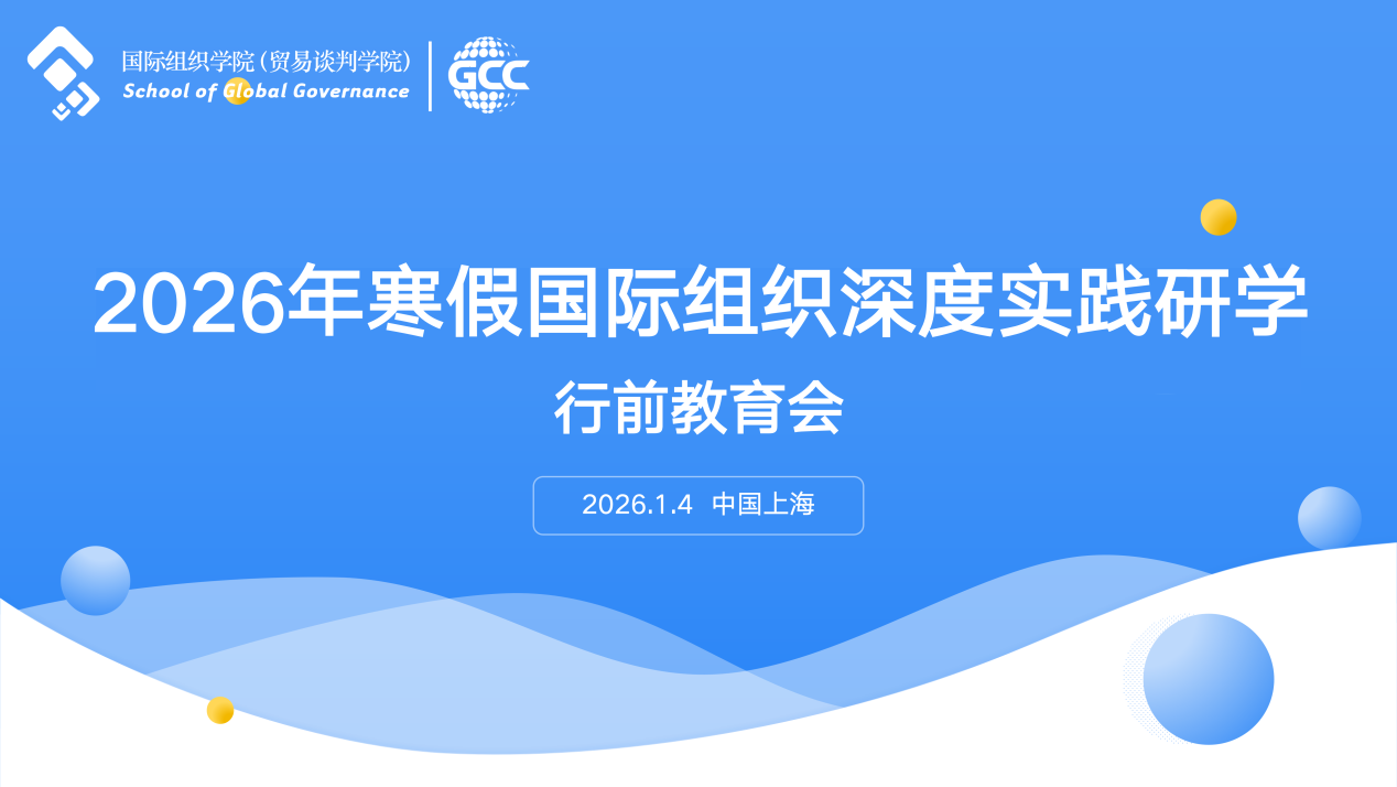 上海对外经贸大学2026年寒假国际组织深度实践研学项目经过前期遴选与筹备,现已准备就绪。为保障研学项目顺利开展,1月4日,上海对外经贸大学国际组织学院(贸易谈判学院)、全球胜任力中心在松江校区学思楼A104室召开行前教育会。校外事处副处长孟维亮,国际组织学院(贸易谈判学院)副院长徐昕、党委副书记程栋,项目带队教师韩笑,全球胜任力中心教师殷凯笛以及全体学员参会。