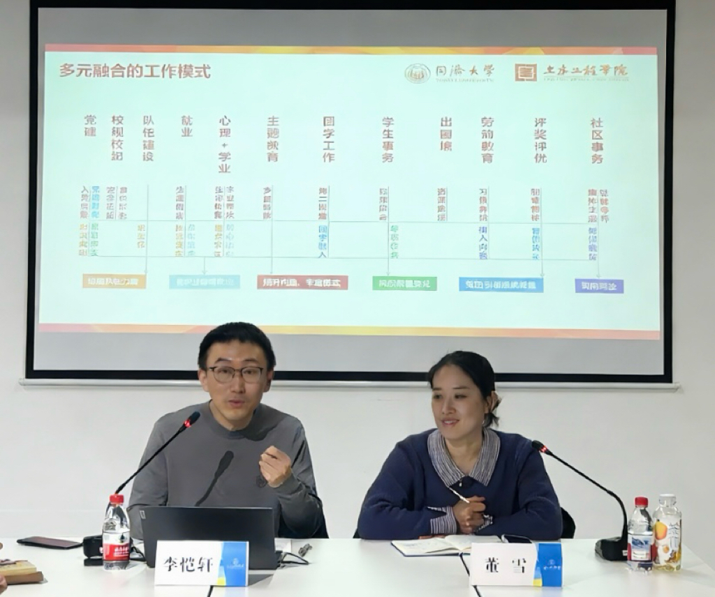 李恺轩从同济大学土木工程学院学生与辅导员队伍基本情况切入,围绕“守住底线、争取高线、不触红线”三大维度,传递思政育人与精准施策的工作理念:“守住底线”是以“育人为本”为核心,聚焦学生成长安全与权益保障。针对重点学生以“前置沟通留痕、家校协同发力、分类精准帮扶”的育人举措,凝聚“1+N”帮扶合力,明确辅导员的角色定位,守护育人底线。“争取高线”是以提质赋能、育优成才为目标,锚定育人质量提升方向。以党建引领为核心,深化“一站式”学生社区育人成效,推动党团工作与生涯规划、劳动教育深度融合,通过“纵贯横联”的就业育人体系与分级保障机制,助力毕业生高质量就业。“不触红线”则是以正己修身、坚守初心为遵循,坚守师德师风与意识形态阵地。注重个人言行及师德师风建设,不断提升育人能力,以以身作则的示范作用践行立德树人使命。