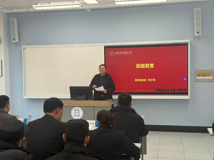 1月13日,学校2025年度保安队伍总结表彰大会在松江校区学思楼C104召开。学校党委保卫部部长、保卫处处长李少丹,保卫处各科室负责人,上海鸿俊保安服务有限公司副总经理刘勇等公司领导,以及来自松江、长宁、闵行三校区及学生社区的保安队员(在岗队员除外)参加会议,旨在全面总结2025年校园安保工作成效,表彰先进典型,部署2026年平安校园建设任务。会议由保卫处治安防范科科长闫一博主持。