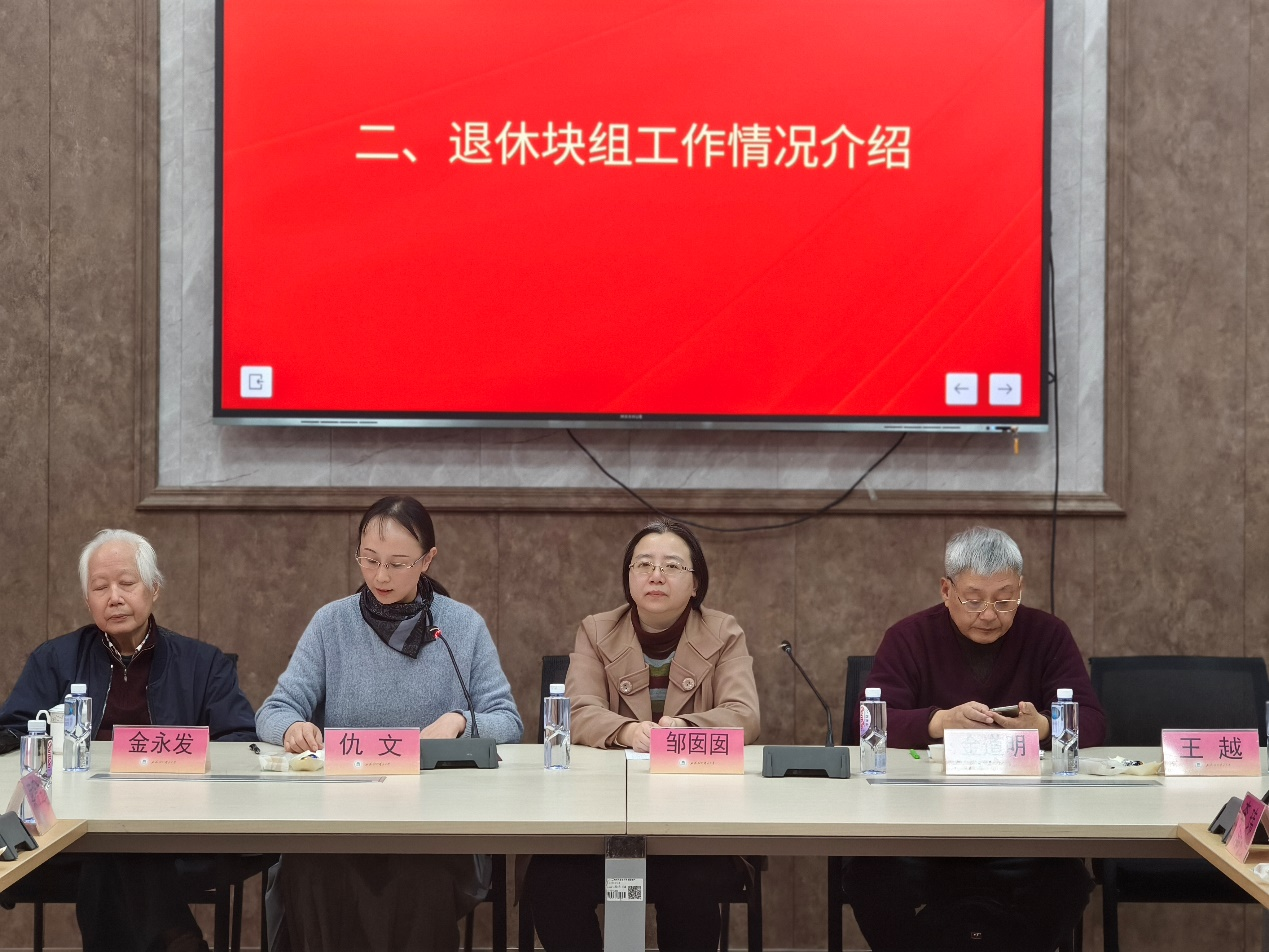 离退休党委副书记、老干部办公室副主任仇文对2025年度块组长工作作了回顾和总结。她以翔实的数据解读了块组长工作的丰富内涵和重要作用,指出块组长是老同志工作体系的基础支撑,是保障老同志工作稳妥开展的重要力量,是离退休党委厚植群众基础、紧密联系群众的重要桥梁,也是信息传达、民情收集的重要渠道。无论是党支部委员还是块组组长,都充分展现了“为人民服务”的高尚情操和“无私奉献”的宝贵品质。仇文强调了块组工作以“新老”助“长老”的优良传统,并与邹囡囡共同主持了青浦块组长曹冬梅老师的“荣退”仪式和曹冬梅老师与葛军芳老师的块组长职务交接仪式。