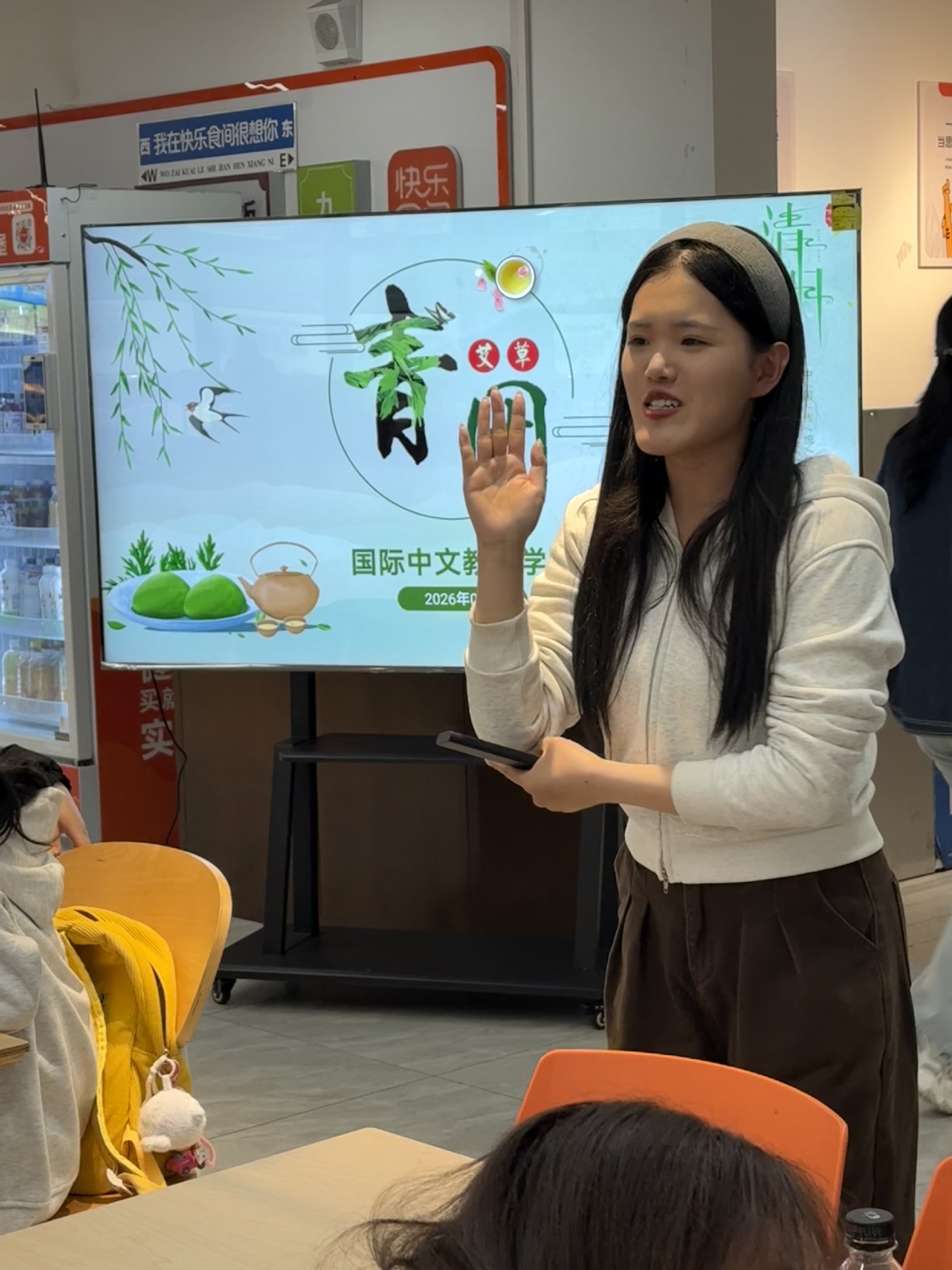 活动伊始,小课堂开启“知习俗,品文化”的文化学习之旅学院研一学生黄思雅细致梳理清明的起源与发展,生动介绍扫墓祭祖、踏青郊游、插柳植树等清明传统习俗,让留学生了解这一传统节气背后的文化内涵。学院研一学生郭红丽以互动小游戏的形式,深入讲解青团的文化寓意,穿插分享中式糕点的趣味历史小故事,轻松活泼的氛围让大家对这份春日特色美食充满好奇,也对中华饮食文化有了更具象的认知。