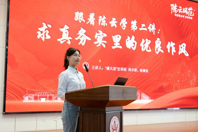 本次宣讲紧扣习近平总书记在纪念陈云同志诞辰120周年座谈会上的重要讲话精神,选取“陈云风范”系列微课的第一讲《跟着陈云学初心:民生小事里的公仆情怀》和第二讲《跟着陈云学笃行:求真务实里的优良作风》,由学院研究生于金阳与本科生周卓群、陈雅欣接力主讲,40分钟的微课以小切口展现大主题,用青年视角讲活红色故事。
